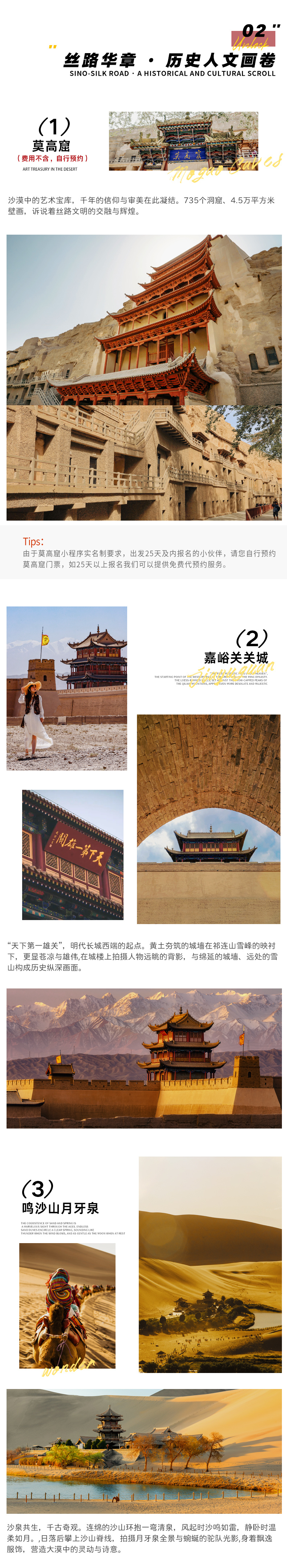 2、莫高窟的预约时间请大家尽量选择上午场的,难免会出现小伙伴们互相等待的情况,敬请谅解,如您报名较晚莫高窟门票已售罄的情况,则可以自由游览市区内其他景区。