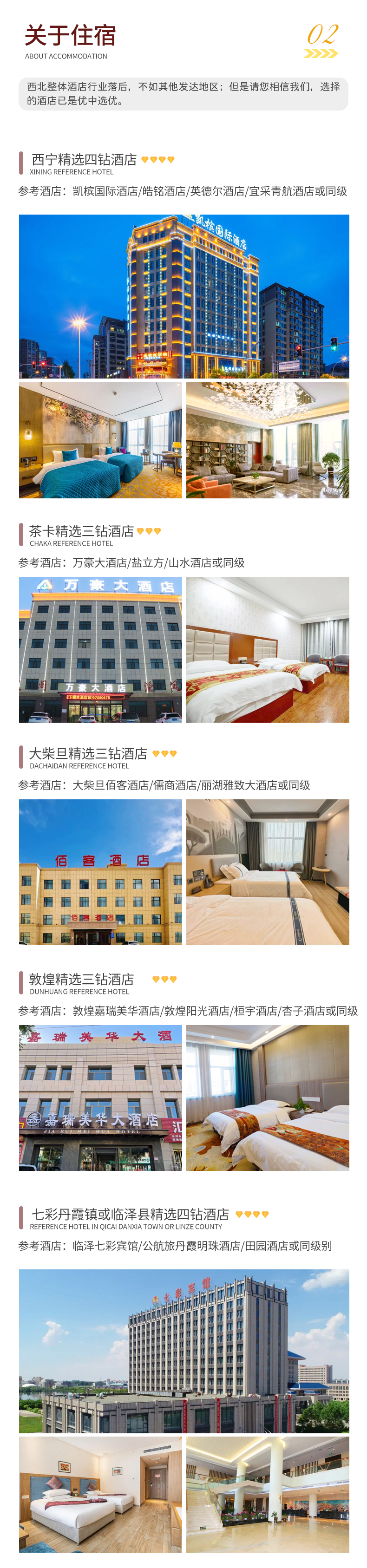 备注:钻级标准参考携程钻级标准,西北经济发展较差,酒店已经是我们精心挑选的,但是和大城市同级别酒店相比各方面略差一些,敬请您谅解;