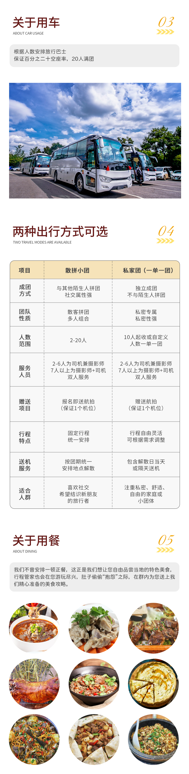 3、用车:2-3人用5座SUV,4-5人用7座商务车,6人用9座商务车,7人及以上根据人数安排旅行巴士,保证百分之二十空座率。
