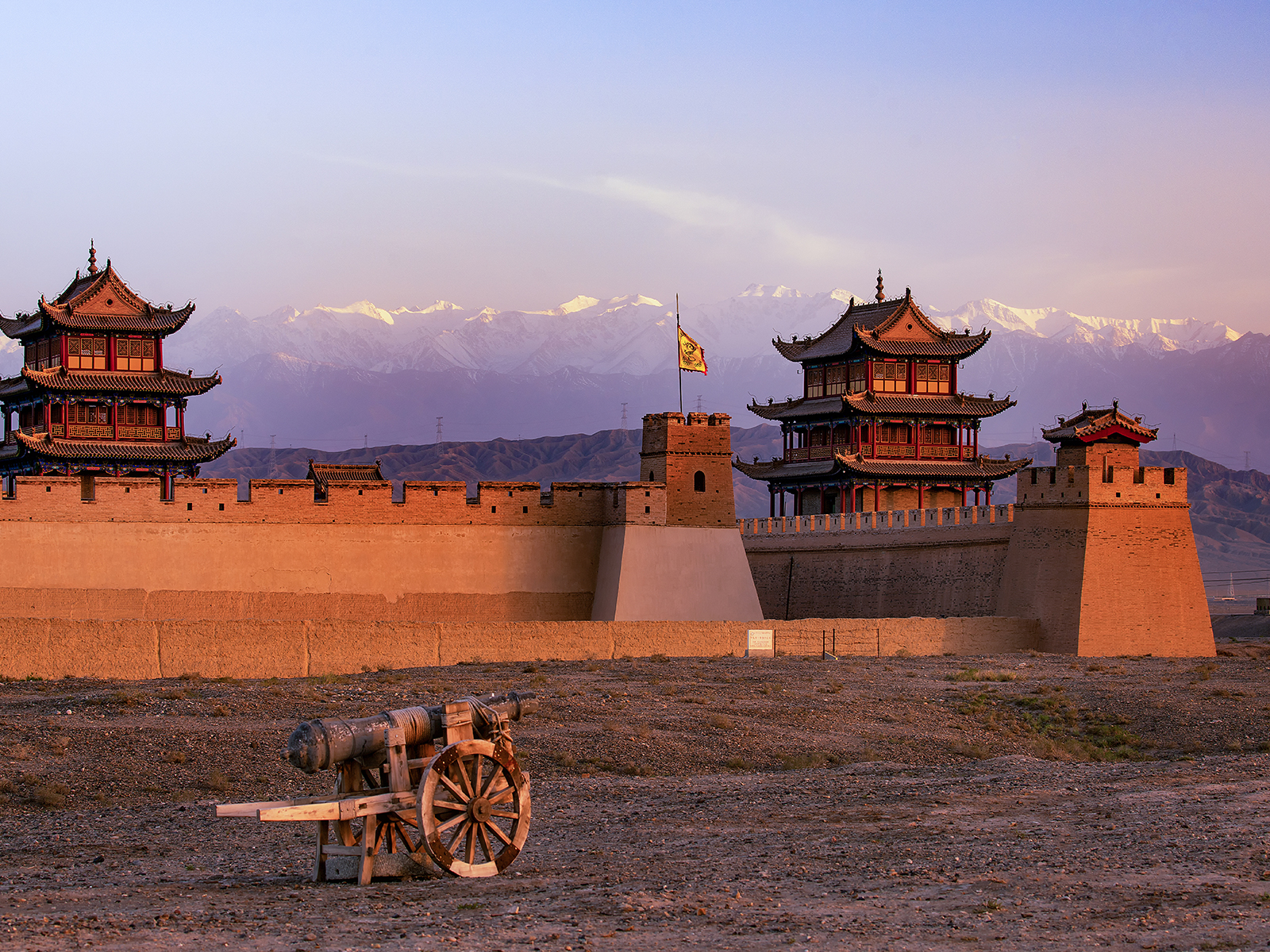 13 : 30抵达【嘉峪关关城】,从关外看去,巍峨雄壮的关城及瓮城伫立在夕阳之下,一派庄严。几百年前的大青石,依旧在这里默默地承载着历史的厚重。 嘉峪关外,是延绵的祁连山脉,远处的山顶可见积雪,天空的灿烂云霞将嘉峪关关城衬托地更加壮美。我们在这里尽情拍照,感受着这里每一块城墙砖的前世今生。