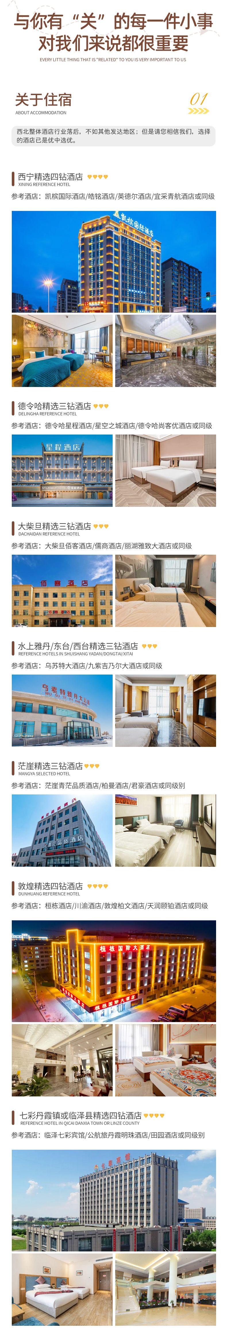 备注:钻级标准参考携程钻级标准,西北经济发展较差,酒店已经是我们精心挑选的,但是和大城市同级别酒店相比各方面略差一些,敬请您谅解;