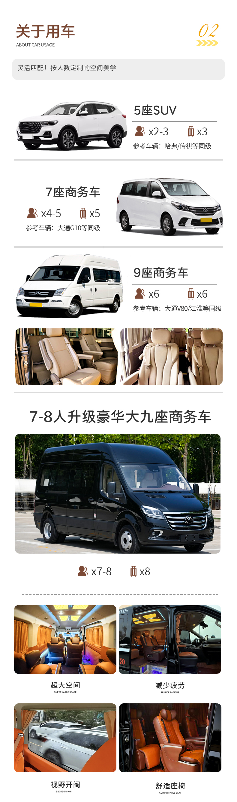 用车:2-3人用5座SUV,4-5人用7座商务车,6人用普通9座商务车,7-8人用改装大九座商务车(小团副驾驶及前后座位置需要轮流乘坐,望悉知)
