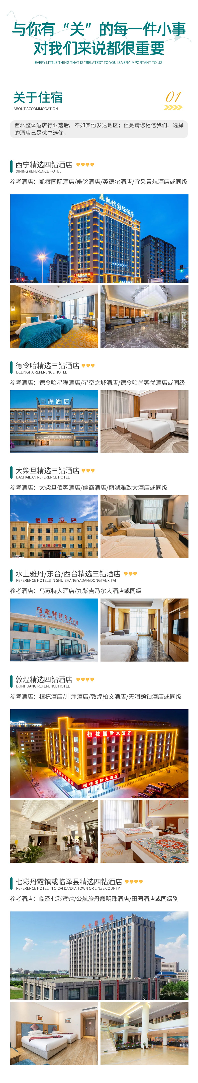 备注:钻级标准参考携程钻级标准,西北经济发展较差,酒店已经是我们精心挑选的,但是和大城市同级别酒店相比各方面略差一些,敬请您谅解;
