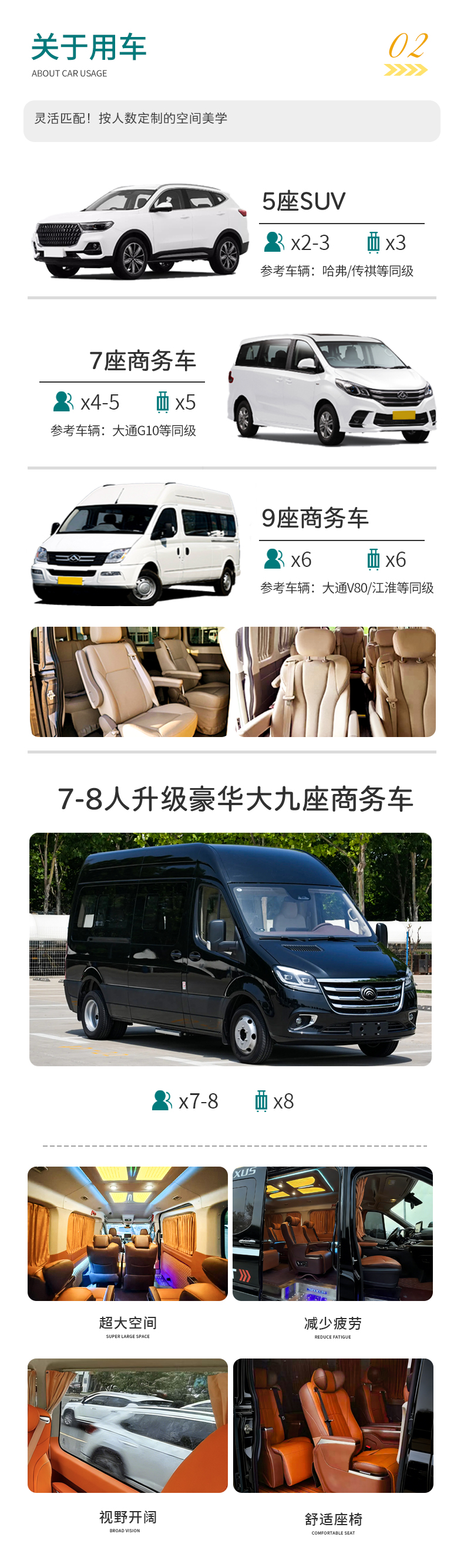 用车:2-3人用5座SUV,4-5人用7座商务车,6人用普通9座商务车,7-8人用改装大九座商务车(小团副驾驶及前后座位置需要轮流乘坐,望悉知)