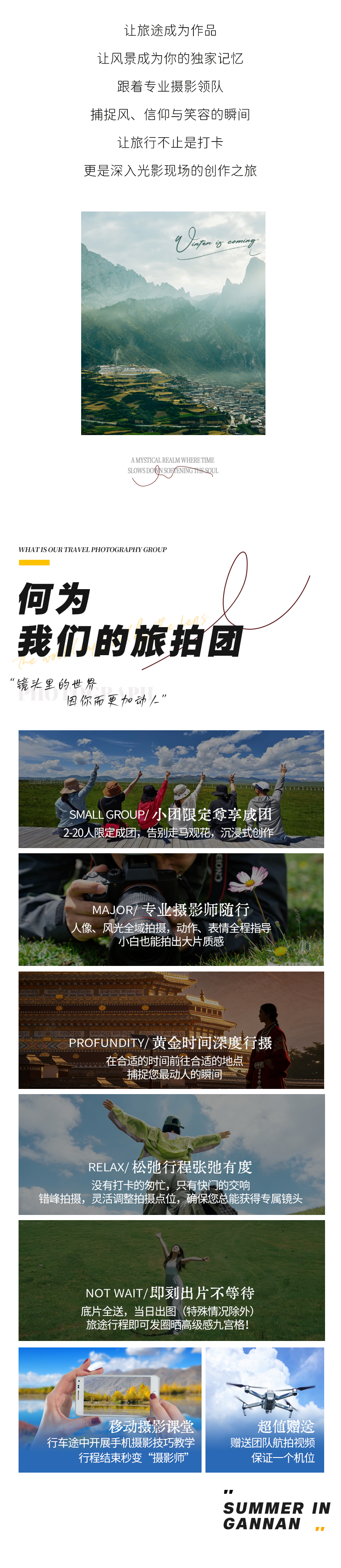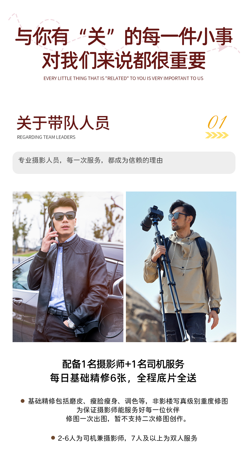 摄影师:当期满7人安排1名摄影师全程单反摄影,不足人数为司机兼摄影师(出行前两天发出行短信,景区内司机无法陪同游玩),为保证每位客人的照片张数及质量,摄影师会进景区进行拍摄,以每个人都出片为目的,但是并非专业导游不提供讲解及全程陪玩服务,望悉知。