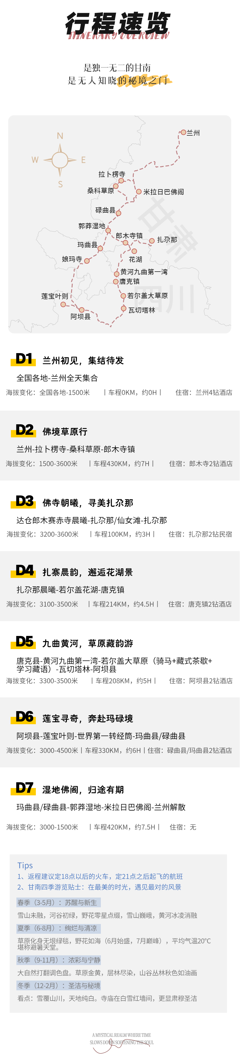 碌曲县/玛曲县-(70km,约1h)郭莽湿地-(120km,约2.5h)米拉日巴佛阁(230km,约4h)-兰州解散