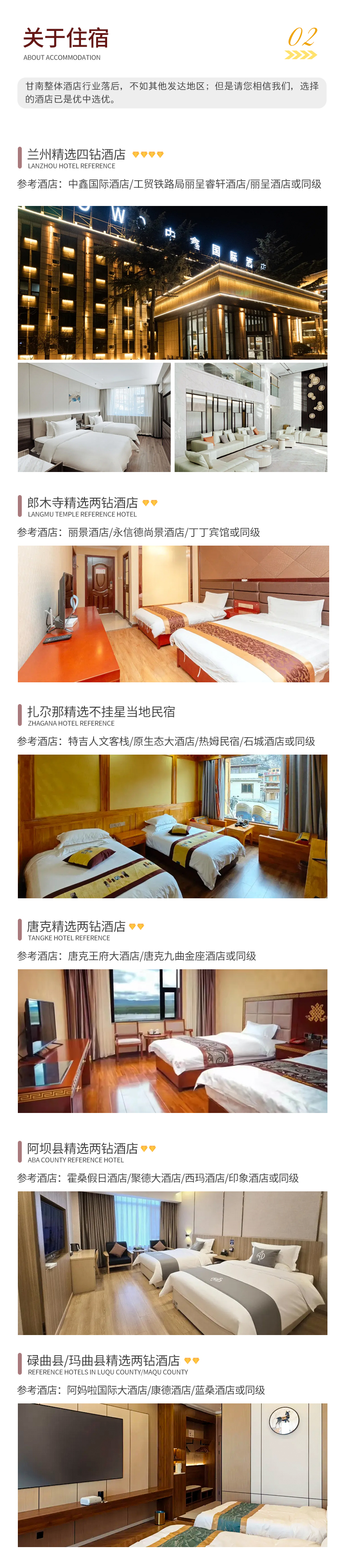 1、住宿:兰州4钻酒店标间1晚、郎木寺镇2钻酒店标间1晚、扎尕那藏式民宿标间1晚、唐克县2钻酒店标间1晚、阿坝县2钻酒店标间1晚、玛曲县/碌曲县2钻酒店标间1晚