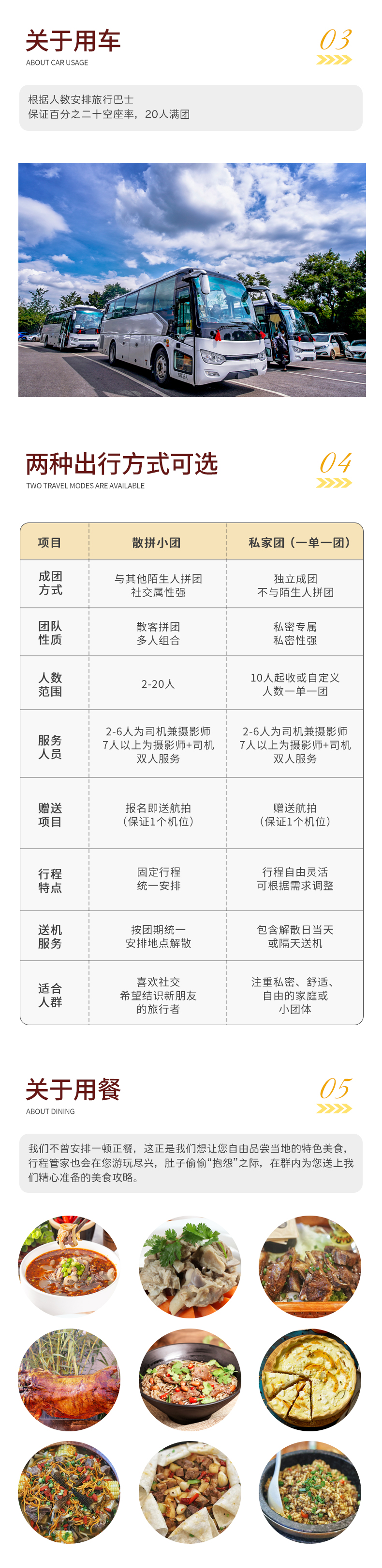3、用车:2-3人用5座SUV,4-5人用7座商务车,6人用9座商务车,7人及以上根据人数安排旅行巴士,保证百分之二十空座率。