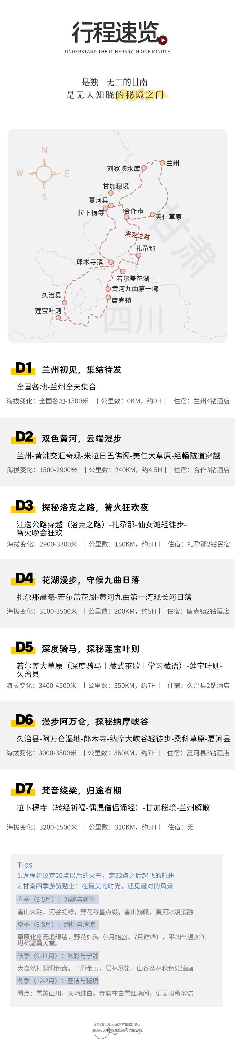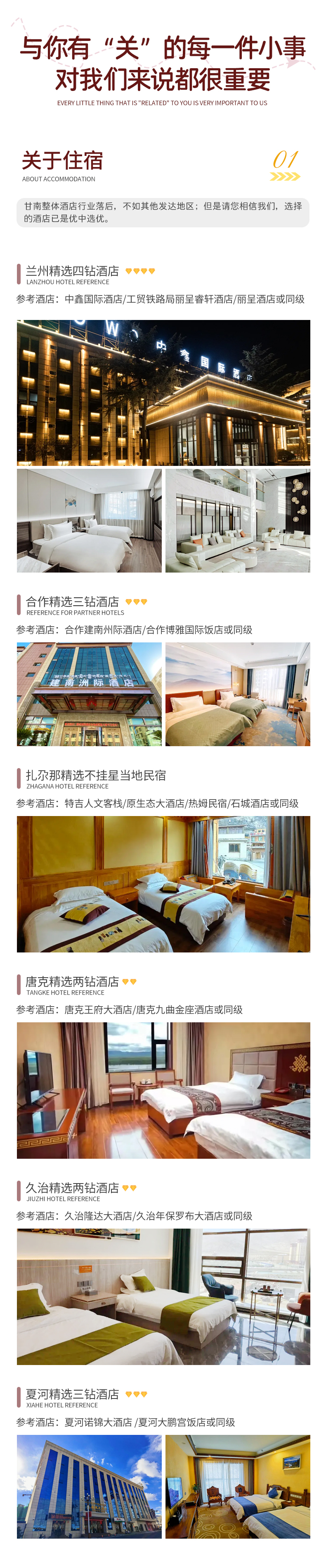 1、住宿:兰州4钻酒店标间1晚、合作市3钻酒店标间1晚、扎尕那不挂星藏式民宿标间1晚、唐克镇2钻酒店标间1晚、久治县3钻酒店标间1晚、夏河县3钻酒店标间1晚