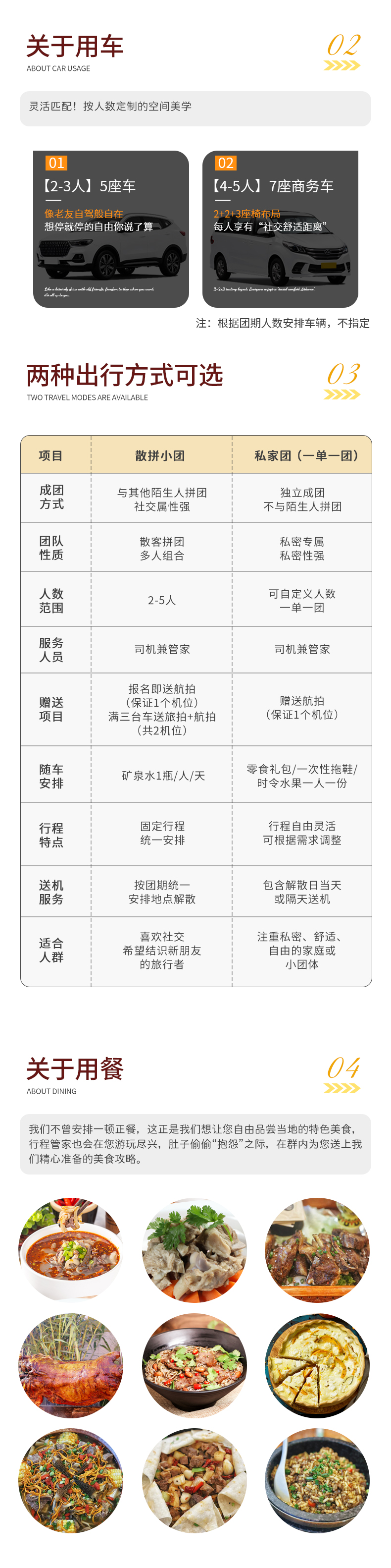 3、交通:2-3人使用5座SUV,4-5人使用7座商务车,根据当期人数安排车辆,不指定车辆。(小团副驾驶及前后座位置需要轮流乘坐,望悉知)