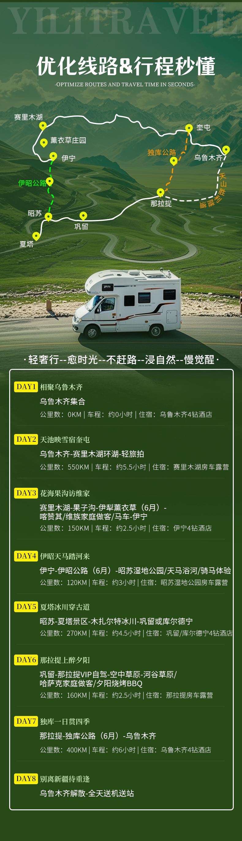 1、住宿:乌鲁木齐4钻酒店双人标间2晚,赛里木湖景区停车区房车露营1晚,伊宁4钻酒店双人标间1晚,昭苏湿地公园营地房车露营1晚,巩留4钻酒店双人标间1晚,那拉提自驾营地房车露营1晚,共7晚住宿;