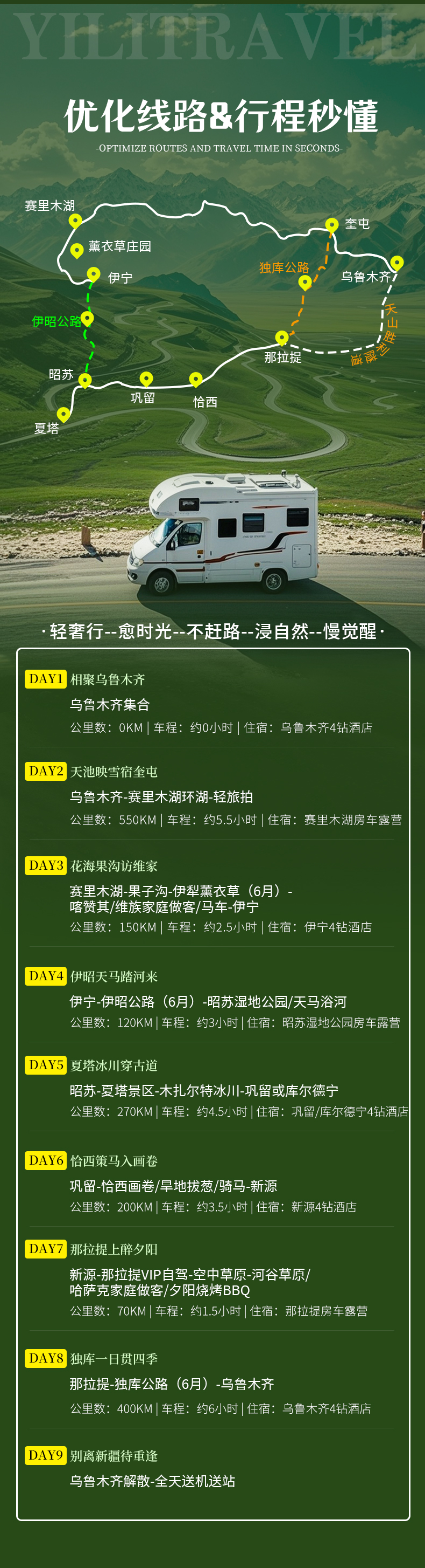 1、住宿:乌鲁木齐4钻酒店双人标间2晚,赛里木湖景区停车区房车露营1晚,伊宁4钻酒店双人标间1晚,昭苏湿地公园营地房车露营1晚,巩留4钻酒店双人标间1晚,新源4钻酒店双人标间1晚,那拉提自驾营地房车露营1晚,共8晚住宿;