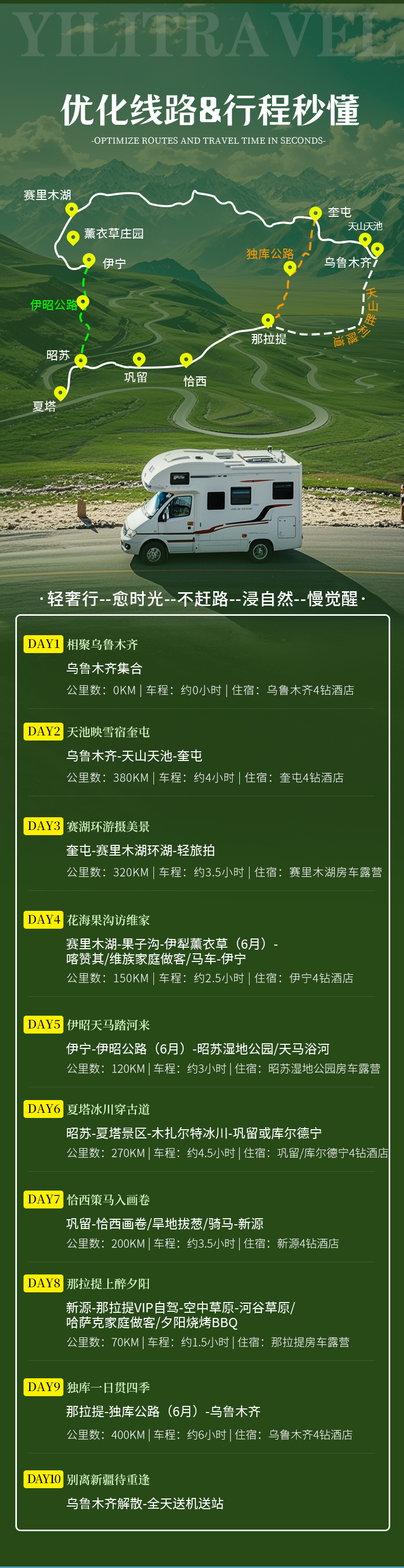 1、住宿:乌鲁木齐4钻酒店双人标间2晚,奎屯4钻酒店双人标间1晚,赛里木湖景区停车区房车露营1晚,伊宁4钻酒店双人标间1晚,昭苏湿地公园营地房车露营1晚,巩留4钻酒店双人标间1晚,新源4钻酒店双人标间1晚,那拉提自驾营地房车露营1晚,共9晚住宿;
