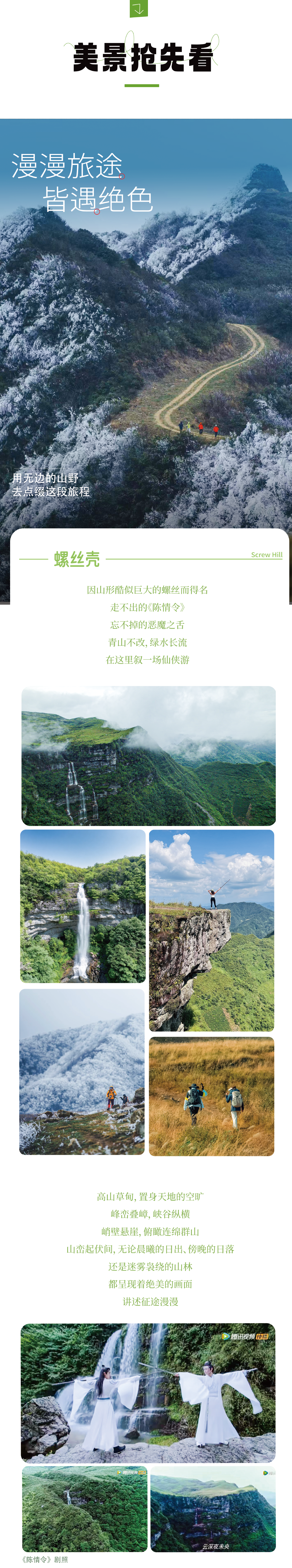 早餐后乘车出发旅程的首个秘境——螺丝壳高山草甸,打卡《陈情令》拍摄地;热身后徒步下至一个不知名却十分壮观的瀑布,随后穿越高山草甸至鹰嘴岩,这里的视野十分开阔,也特别适合出片,随后环线徒步回到起点乘车前往都匀市入住酒店。晚上自由打卡西山大桥、石板街、品尝当地特色美食等。