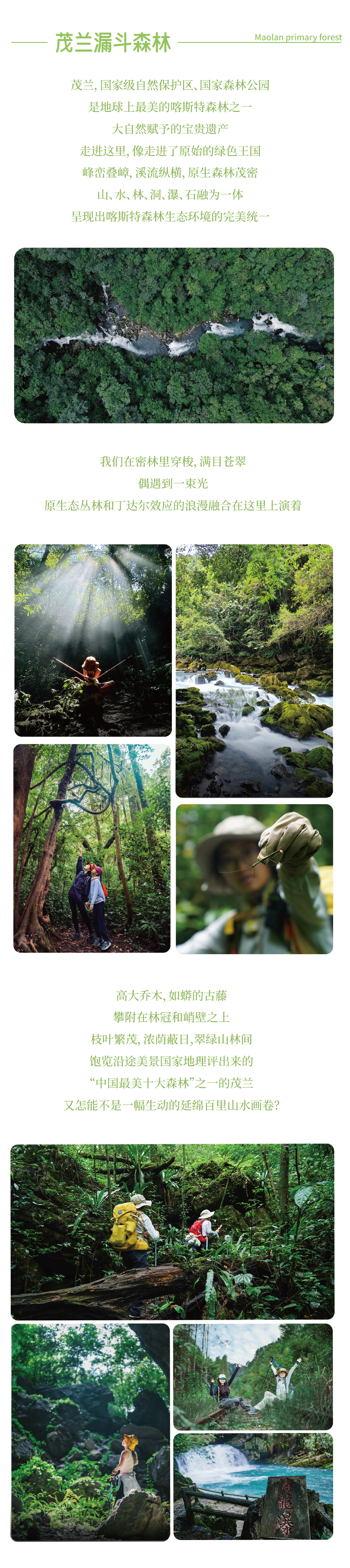 今天,我们将深入被联合国教科文组织誉为“地球腰带上的绿宝石”的茂兰国家级自然保护区。闯入神秘的漏斗森林,仿佛跌进一个被时光遗忘的绿色王国。阳光如金线般从百米高的古树冠隙间洒落,照亮空中花园般的苔藓与蕨类。脚下是厚厚的落叶层,柔软如毯;耳畔是鸟鸣与溪水的合奏,空灵悠远。
