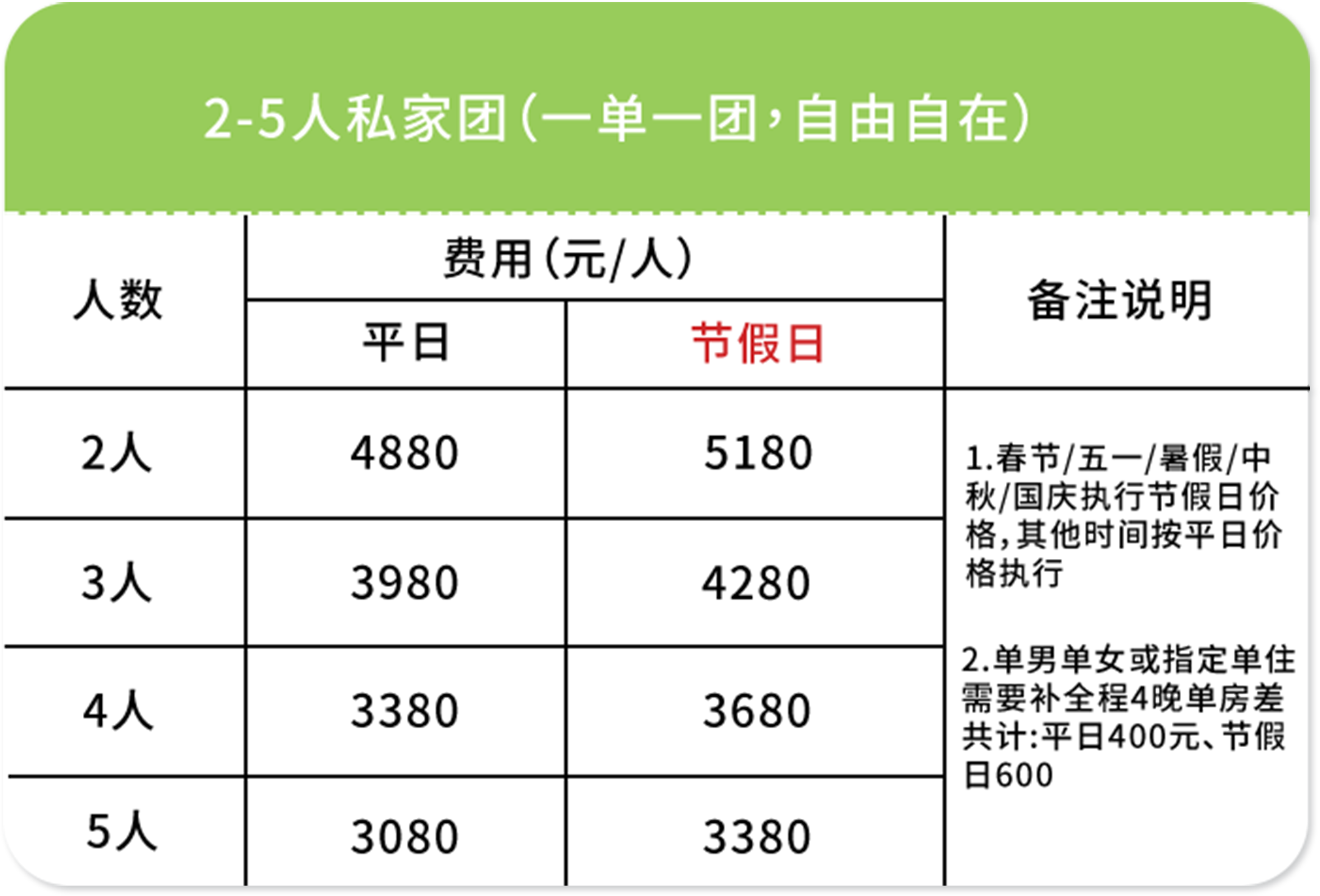 ➂ 单房差:单人报名默认同性拼房(拼房不成功无需另付单房差);指定单住或1成人带1儿童(需补全程4晚单房差价共计:平日400元/春节.五一.暑假.国庆600元)2人一起报名默认住1间房(如需分开住请主动说明)