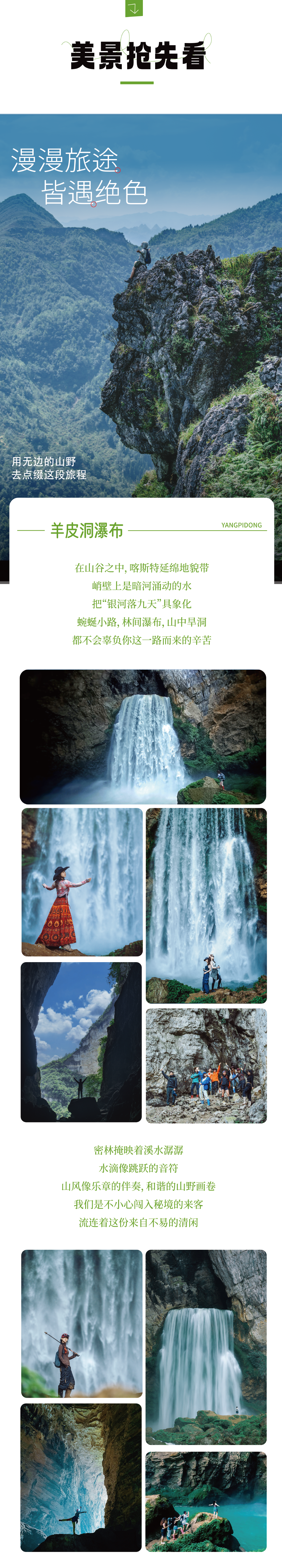 早餐后乘车前往徒步起点。热身后,我们将沿着湿滑陡峭的原始小径下探峡谷,当轰鸣水声渐近,磅礴的羊皮洞瀑布豁然眼前。您可在水雾弥漫中尽情创作大片。中午在开阔处分享自带路餐。下午可随领队探索瀑布旁的洞穴,随后徒步环线返回,乘车回贵阳。
