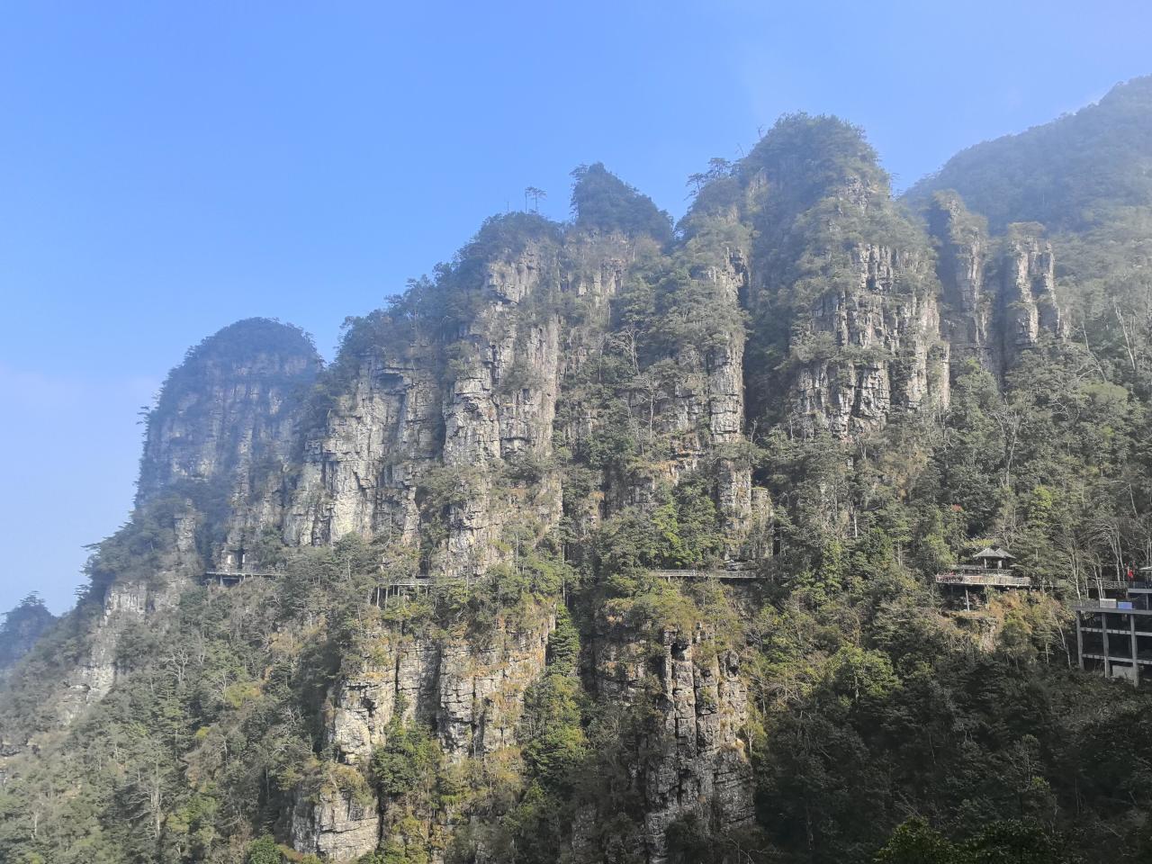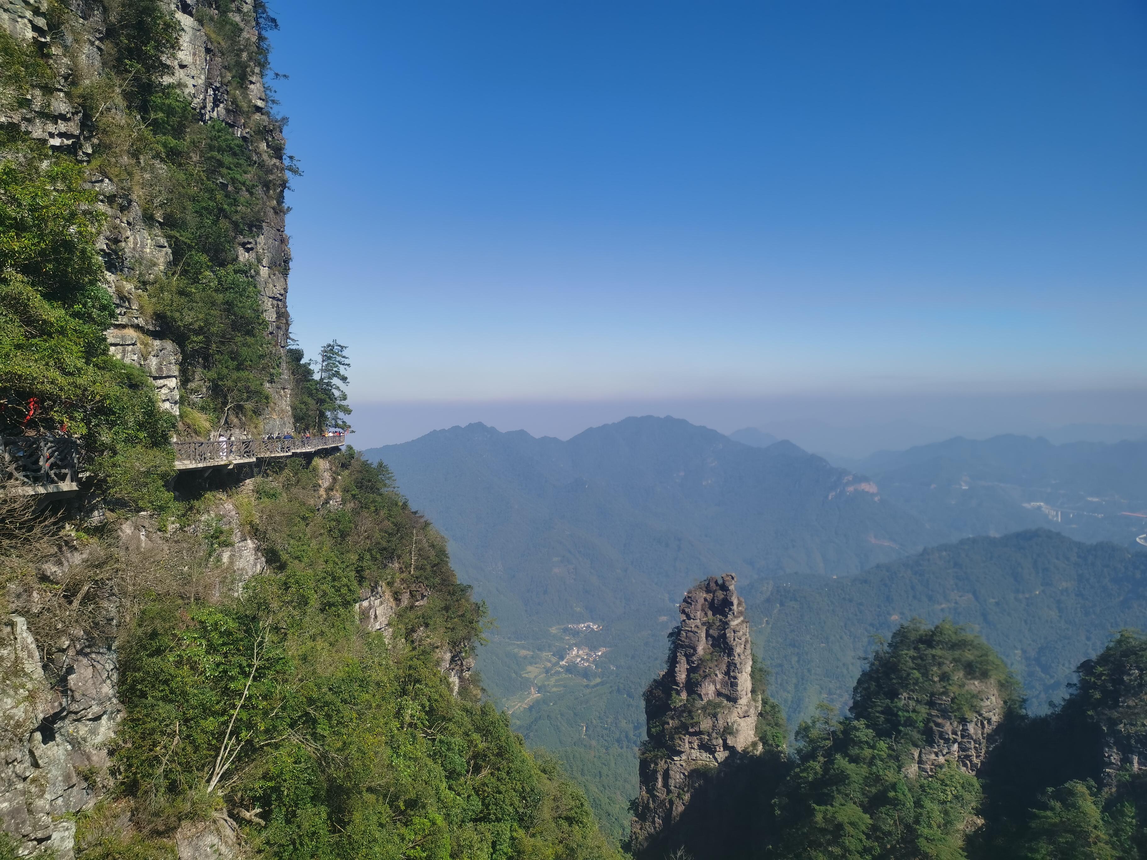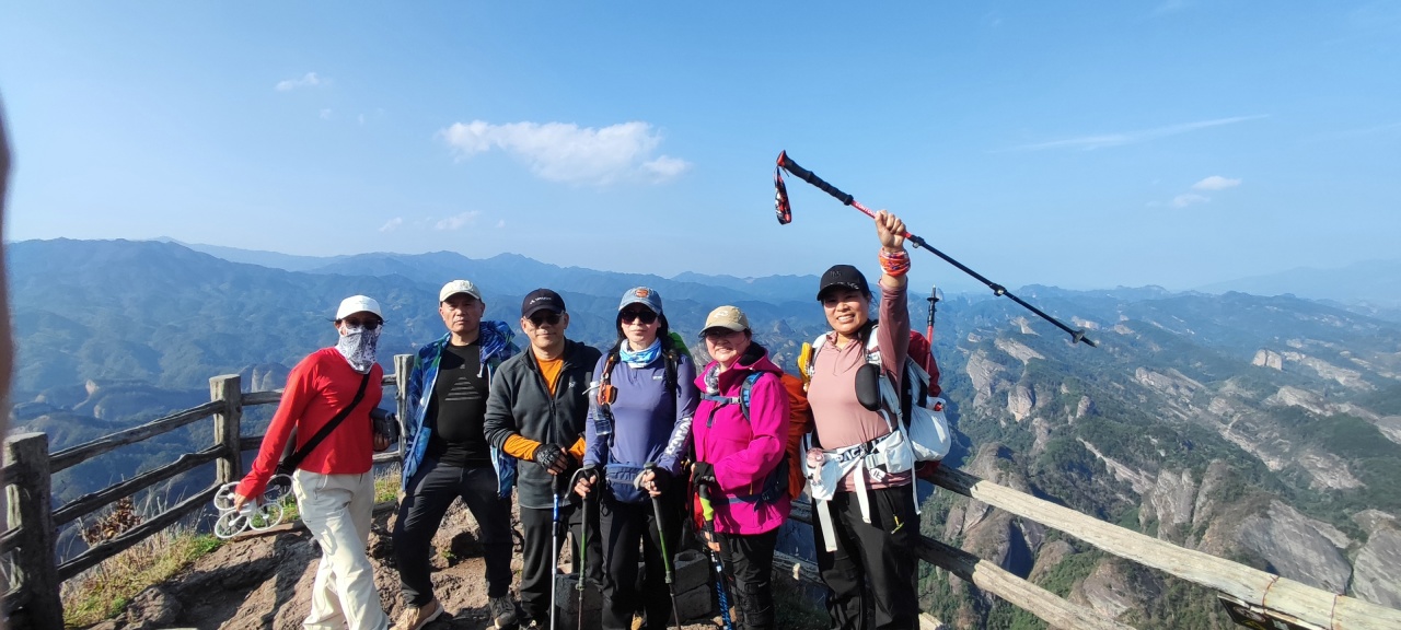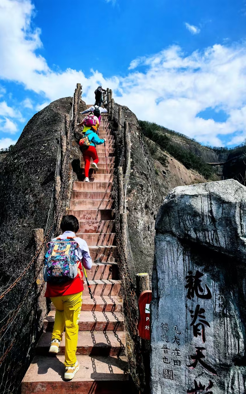 徒步组:群螺观天-龙脊天梯-凌渊谷-跃龙台-一脚踏两省-龙头香-虎头领,公里数约10km, 景区步道+栈道,拔高约500米;