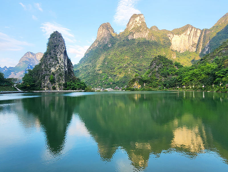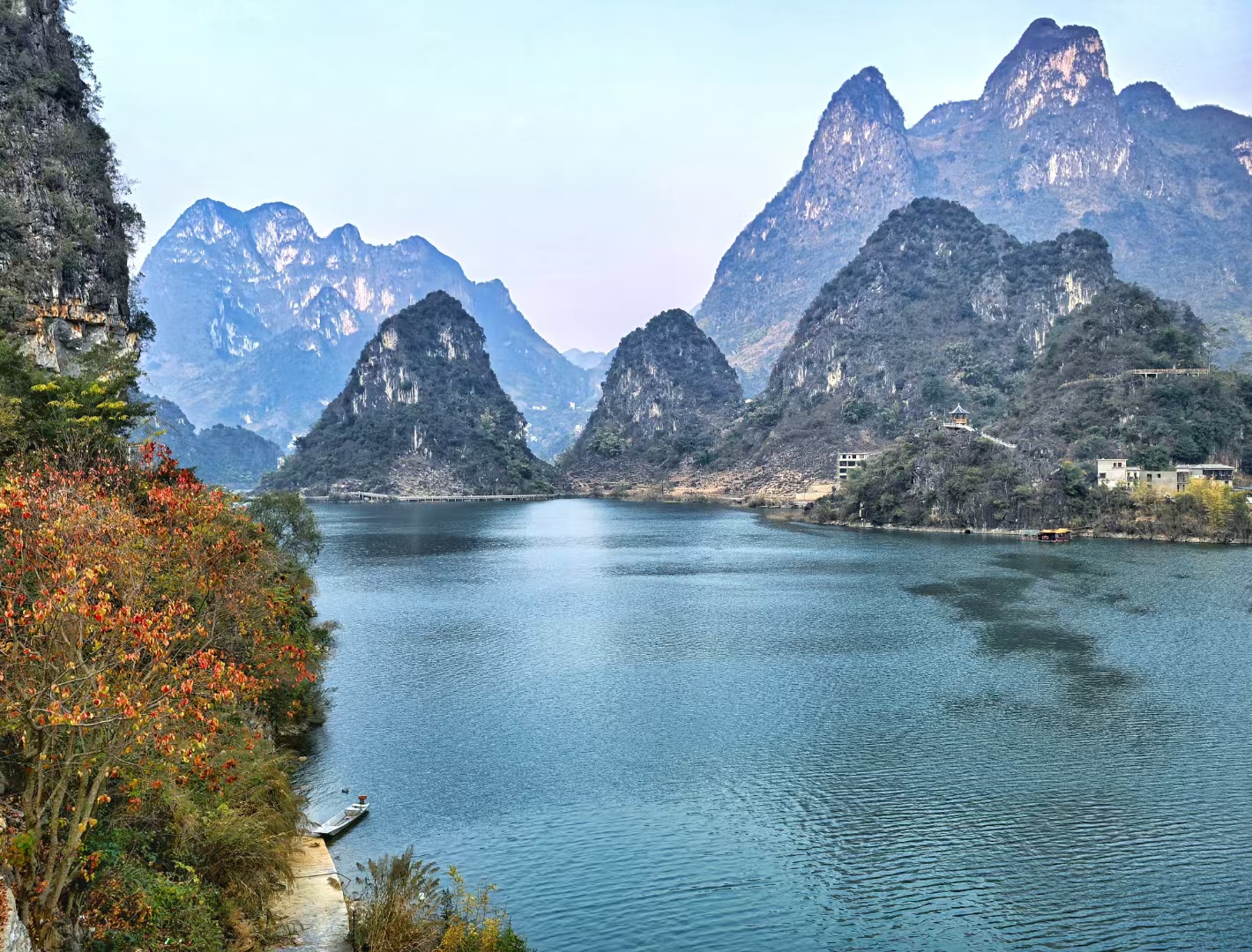 浩坤湖位于百色市凌云县,是凌云高山林立区域最大的一片水面,湖长在丰水期可达15公里,湖面面积约20平方公里。湖水清澈,湖中岛屿交错,两岸石灰岩山峰挟持碧水,形成独特的岩溶地貌景观,发育有天坑、洞穴等地质遗迹。这里设有环湖骑行道和徒步栈道,可体验垂钓、桨板等项目。明代土司岑云汉曾作《东湖游记》刻于石壁,湖光山色与人文历史交融。