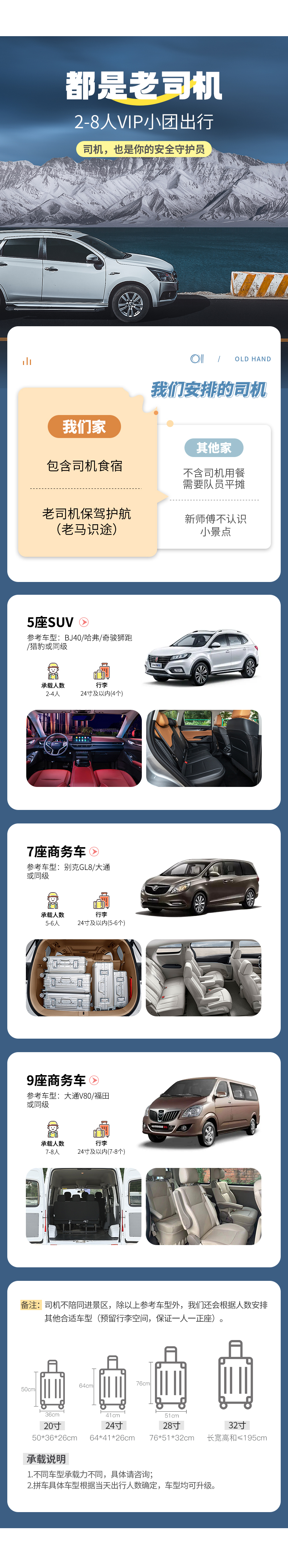 备注:车型承载力有限,携带行李为24寸或以下行李箱。