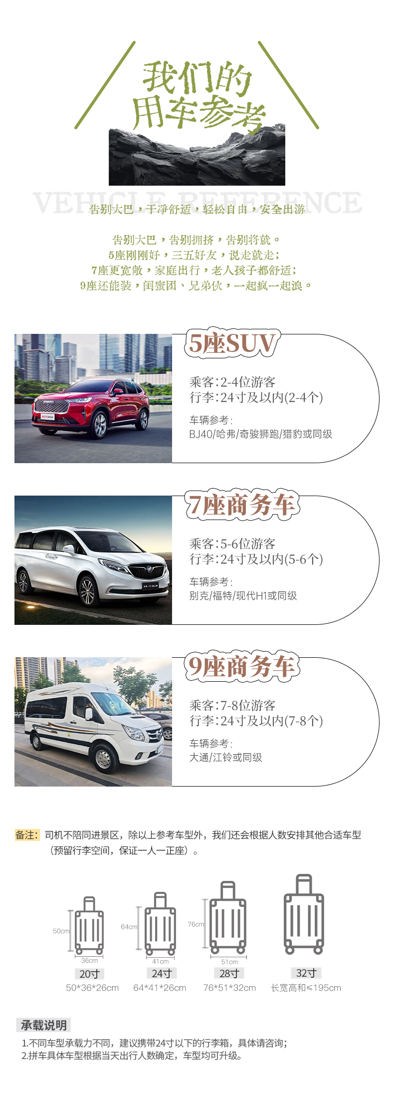 备注:车型承载力有限,携带行李为24寸或以下行李箱。