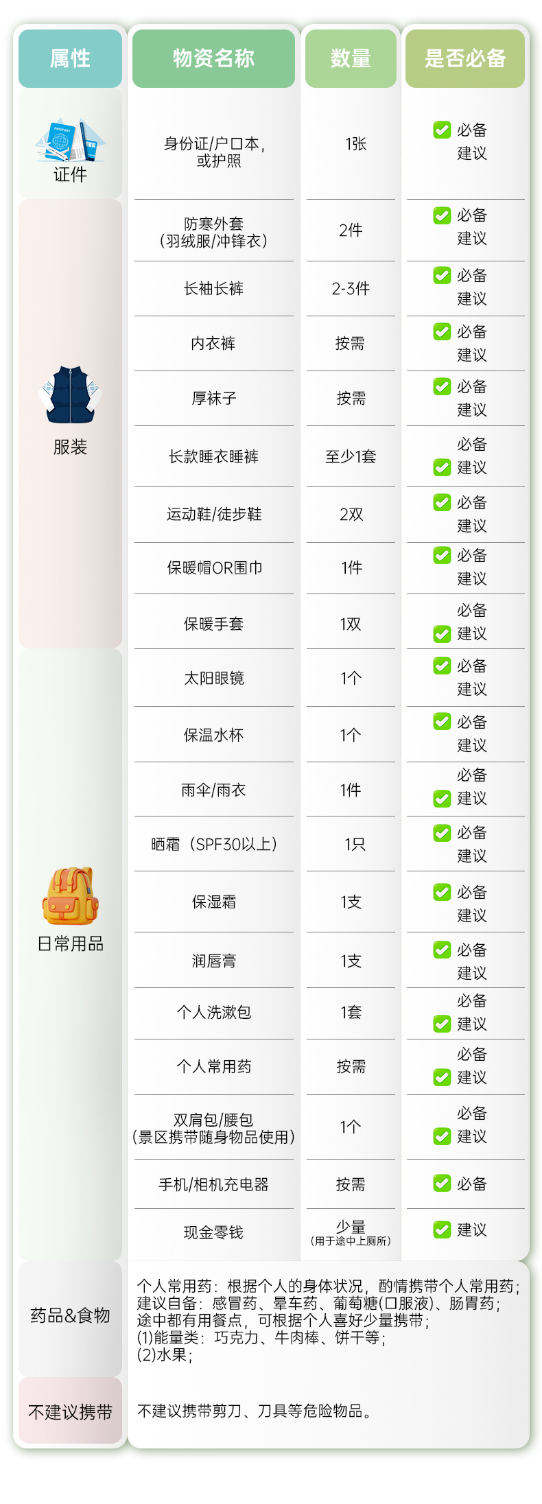 气候多变,昼夜温差大,紫外线强,请大家务必注意防寒与防晒,春夏季节出行,参考以下物品准备行李: