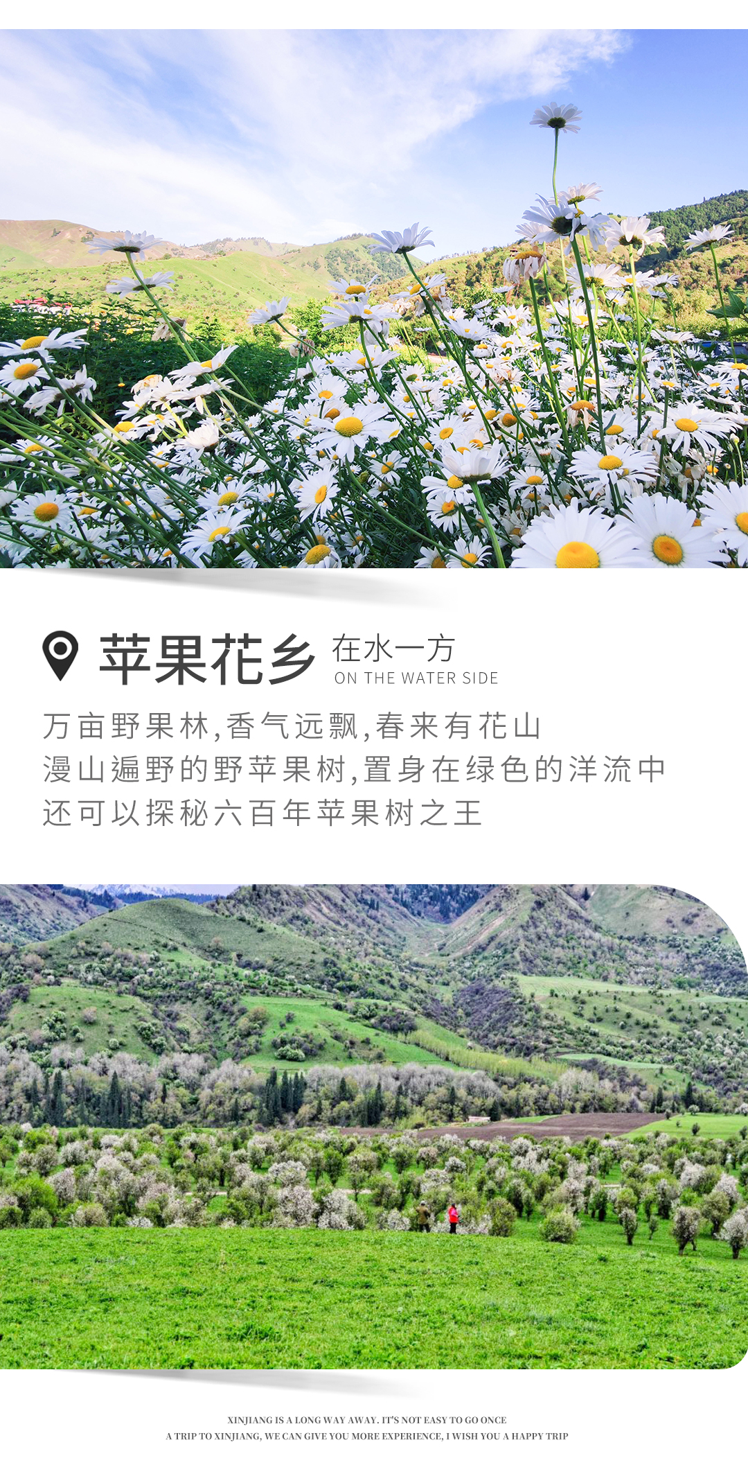 早起后前往萨哈乡,由于交通不便,这里几乎成了一个与世隔绝的地方,仿佛是从诗经里走出来的绝美之地。“萨哈”的汉语意为“在水一方。每逢4月底5月初夏,漫山遍野的野苹果树开着粉的、红的、白的、紫的花,香溢四谷。此时进入林海,身处花海,群蜂嗡嗡,蝴蝶飞舞,其间伴有鸟鸣,真乃修身养性之处,给人以世外桃源之感。今天我们除了拍摄苹果花,还可以探秘六百年果树王,賞黑湖,登望峰台,还可看到哈萨克人跨马扬鞭,一边放着羊群等牲畜,一边驰骋在辽阔的草原。