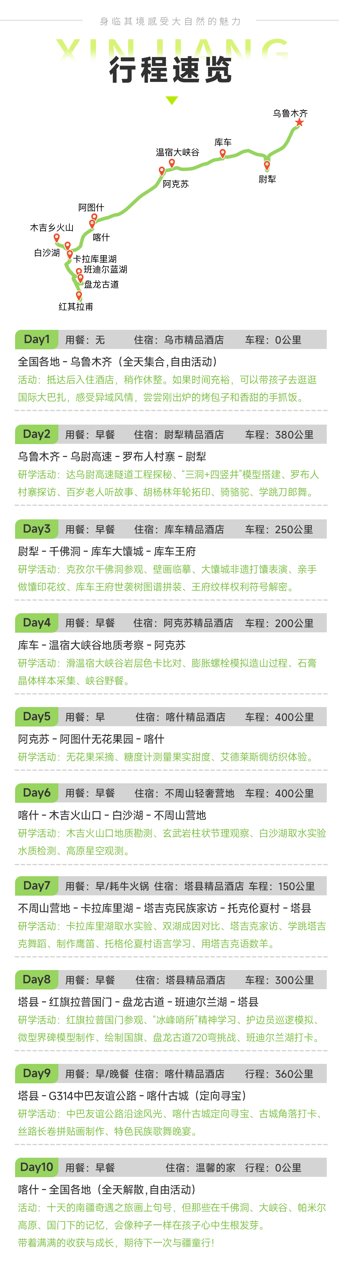 (每周六乌鲁木齐全天集合,周日活动开营,喀什结营全天可返程)