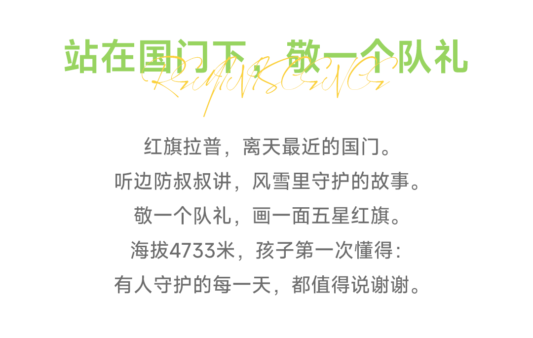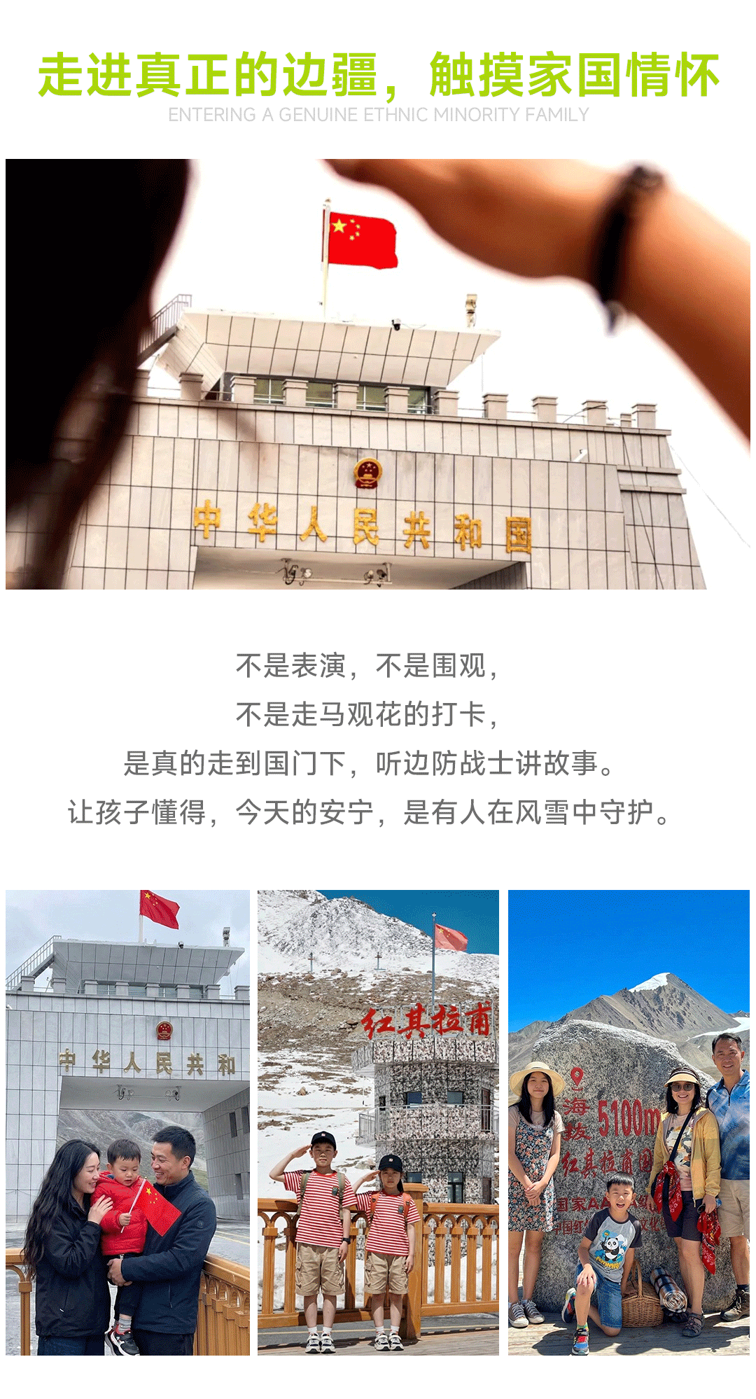 今日起床后,前往红旗拉普国门,解密海拔4733米国门的"冰峰哨所"精神,体验护边员巡逻模拟,建立微型界碑模型,绘制国旗。