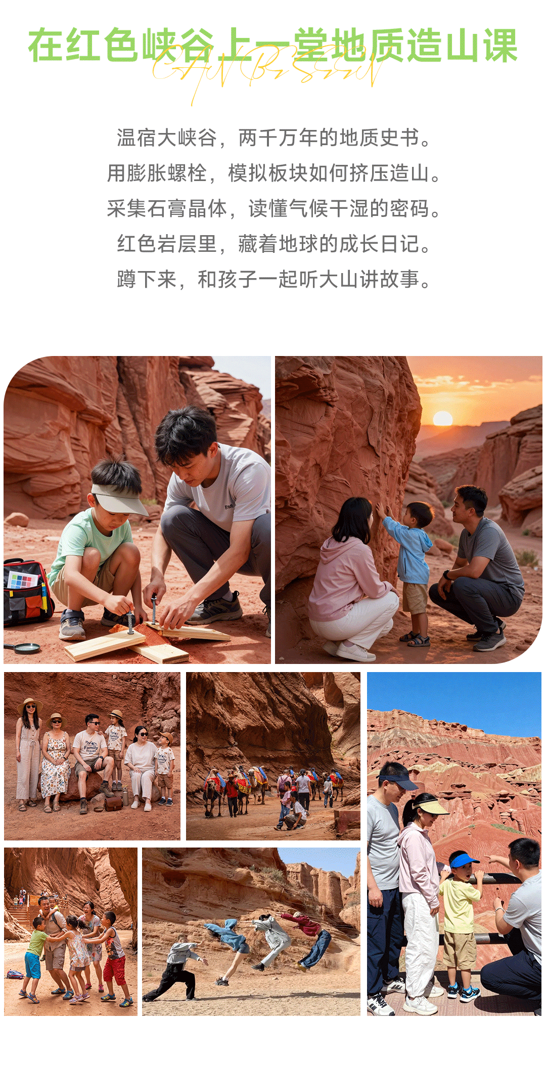 早餐后乘车前往温宿大峡谷,温宿大峡谷作为天山褶皱带的典型剖面,裸露的红色砂岩层完整记录了2000万年来板块碰撞史。今日我们使用色卡比对不同岩层的矿物成分,用膨胀螺栓模拟板块挤压造山过程,采集石膏晶体样本,观察气候干湿变化痕迹。