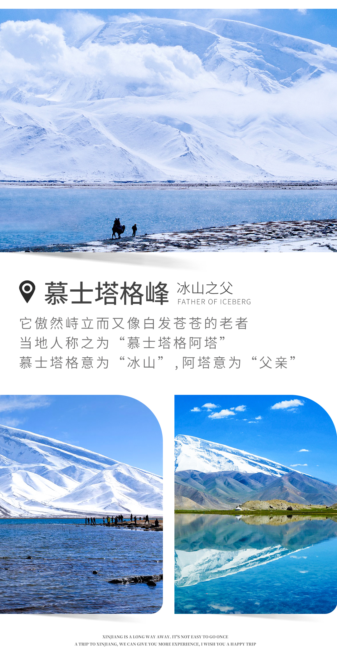 早餐后约8:30集合,赴塔什库尔干塔吉克县。今天第一个停靠点【慕士塔格峰冰川公园】。一路上会经过大片水草丰茂的湿地,遍地牦牛群 ,蓝天白云雪山映衬,景色很美。慕士塔格峰坐落在我国最西部的帕米尔高原上,来这里不用漂洋过海就可一览壮美冰川。山上终年积雪不化,冰珠闪烁,如同一位须发皆白的老父,更因为它是冰川形成最早的山峰,所以被人们称作“冰山之父”。不需要任何装备,游客也可以近距离接触冰川,是一个非常独特的体验。 纯洁高雅的慕士塔格峰在塔吉克族的青年男女眼中是纯洁爱情的象征。它那略带缺口、犹如馒头的峰顶则将永久地停留在旅行者的记忆当中。