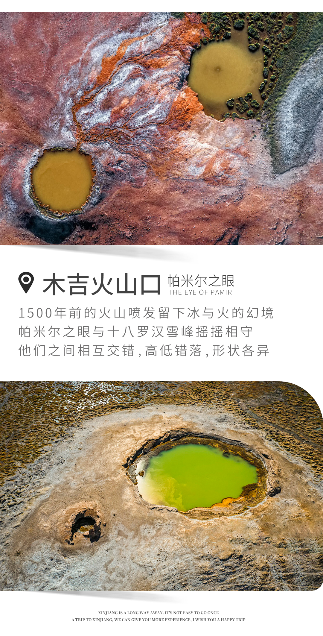中餐后,前往木吉火山口。在新疆最西部阿克陶县木吉乡的帕米尔高原上,有一座似梦幻一般的山谷。它就是有“帕米尔之眼”之称的木吉火山,全名喀日铁米尔火山群。柯尔克孜语,意为“喷发”。1500年前的火山喷发留下冰与火的幻境,与十八罗汉雪峰摇摇相守。虽然它是很久以前喷发的,但目前仍保留着透明的冰川、清澈的冰蚀湖、深不见底的冰洞、甘甜的冰川雪水。在整个卡日铁米尔境内,拥有着大大小小13处火山口,他们之间相互交错,高低错落,形状各异,以它们独特的造型和不同的地质色彩,向人们讲述着一千年前这里发生的故事。