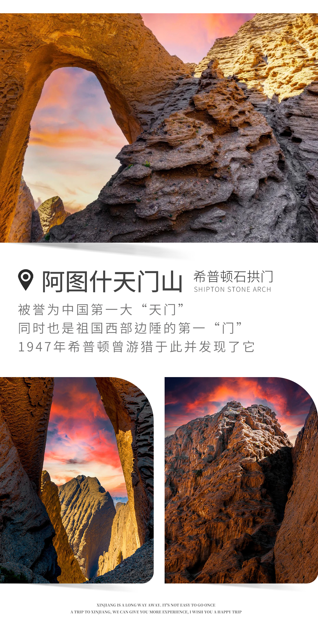 中餐后出发去【阿图什天门山】,这座“天门”耸立在帕米尔高原上,呈“∩”字型,宽约100米,500余米高,,厚度无法丈量,如一座天门屹立在旷野中,“欲与天公试比高”,虽在蓝天之下,大多时又在云雾之中,形成一道天然自然景观,鬼斧神工,天照地设。