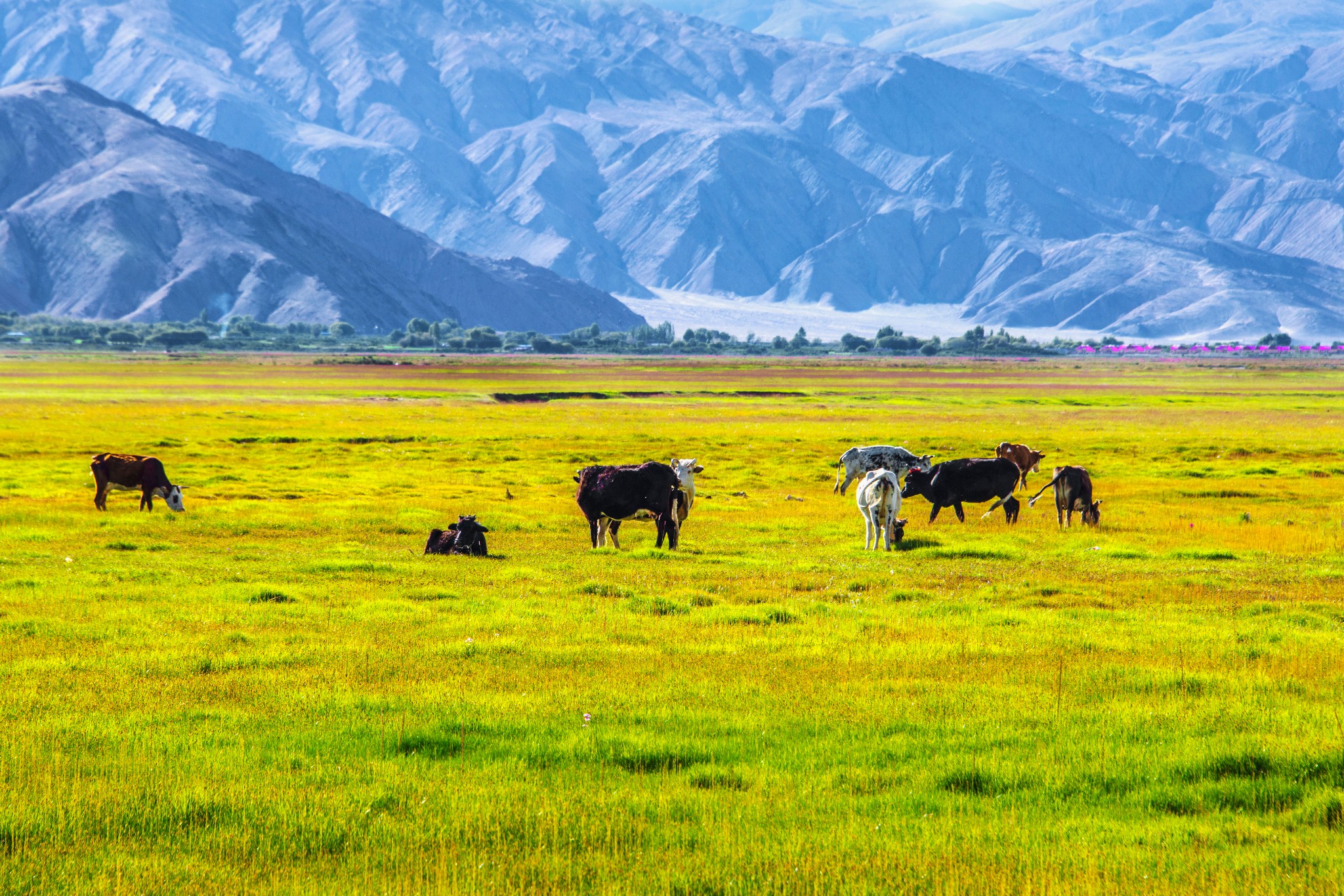 早起后打卡隐藏款【托格伦夏村】,这里小众而美丽,村庄的四周有巍峨的雪山、连绵的草原、特色的毡房,辽阔的田园风光让人倍感治愈。