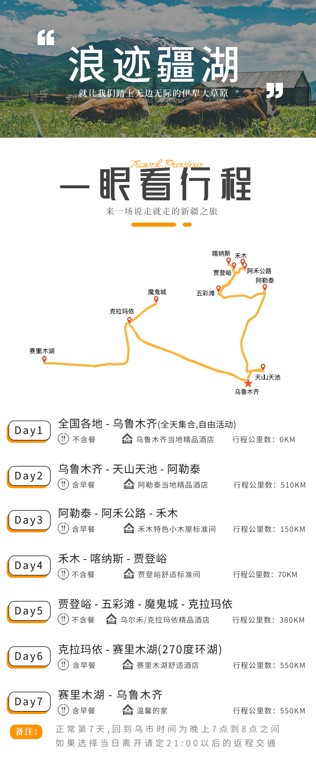 4.行程中的所有出发/抵达时间、行程中游览时间、抵达景点时间等仅供参考,可能会因为淡旺季客流量、路况情况、限速等存在一定的误差,敬请谅解!