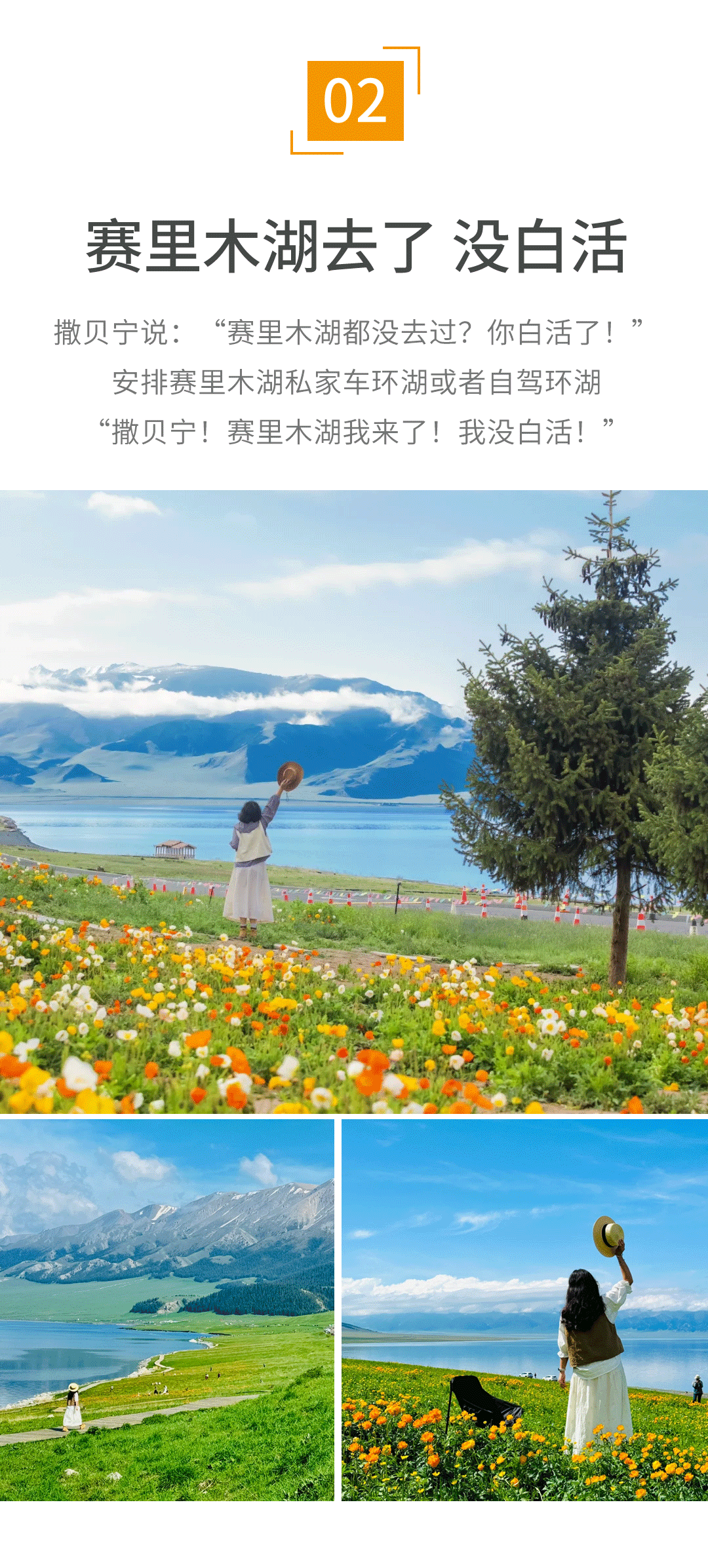 早晨起床后,我们乘车前往【赛里木湖】,赛里木湖是新疆海拔最高、面积最大、风光秀丽的高山湖泊,又是大西洋暖湿气流最后眷顾的地方,因此被称作“大西洋最后一滴眼泪”,它背靠雪山,湖边是广阔的草原,湖水清澈蔚蓝,因风景绝美一直是新疆最著名的几大景点之一。这里最佳游玩季节是每年的六七月份,此时湖边草原上开满了各色的野花,应照着雪山下的蔚蓝湖水,是不可错过的盛景。今天还有本次行程的重点:赛里木湖环湖。我们的车将直接进景区带大家环湖,一边环湖一边下车游玩,从不同的角度欣赏赛里木湖的美。