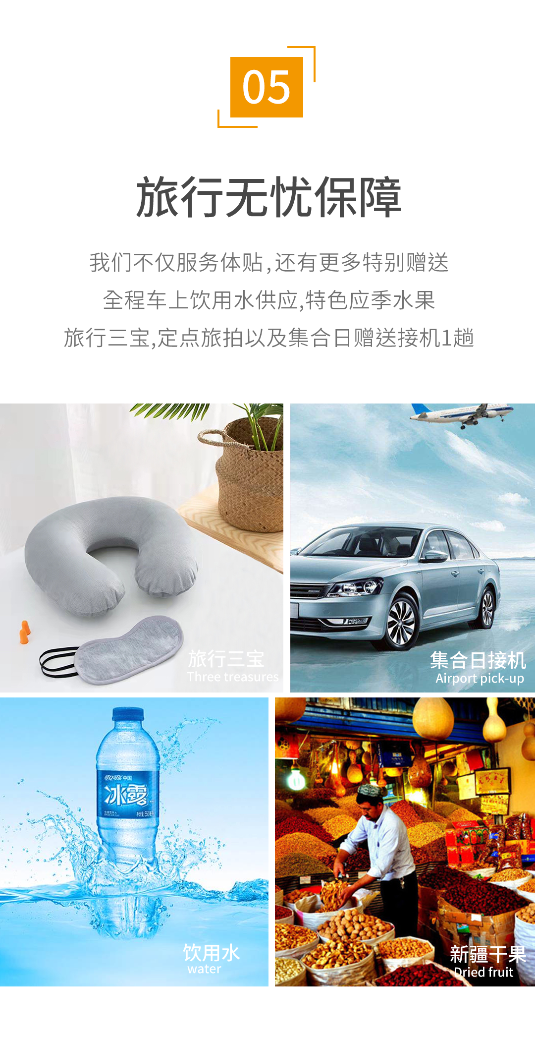 1、随车不限量饮用水及特色应季水果(或者新疆干果);