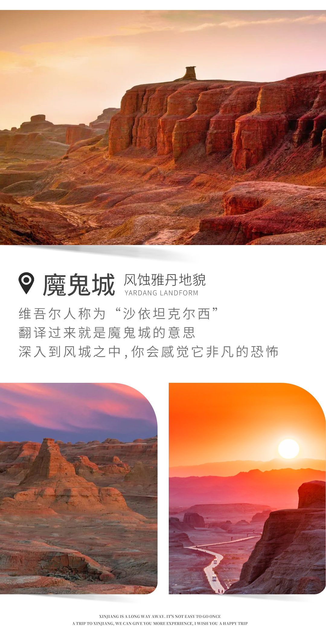 之后前往世界之城-魔鬼城,这里是典型的雅丹地貌区域,该地貌被《中国国家地理》“选美中国”活动评选为“中国最美的三大雅丹”第一名因为地处风口,魔鬼城四季狂风不断,最大风力可达10―12级。强劲的西北风给了魔鬼城的“名”,更让它有了魔鬼的“形”,变得奇形怪状。远眺风城,就像中世纪欧洲的一座大城堡。大大小小的城堡林立,高高低低参差错落。千百万年来,由于风雨剥蚀,地面形成深浅不一的沟壑,裸露的石层被狂风雕琢得奇形怪状:有的呲牙咧嘴,状如怪兽;有的危台高耸,垛蝶分明,形似古堡;这里似亭台楼阁,檐顶宛然;那里象宏伟宫殿,傲然挺立。真是千姿百态,令人浮想联翩。在起伏的山坡地上,布满着血红、湛蓝、洁白、橙黄的各色石子,宛如魔女遗珠,更增添了几许神秘色彩风城地处风口,每当风起,飞沙走石,天昏地暗,怪影迷离。