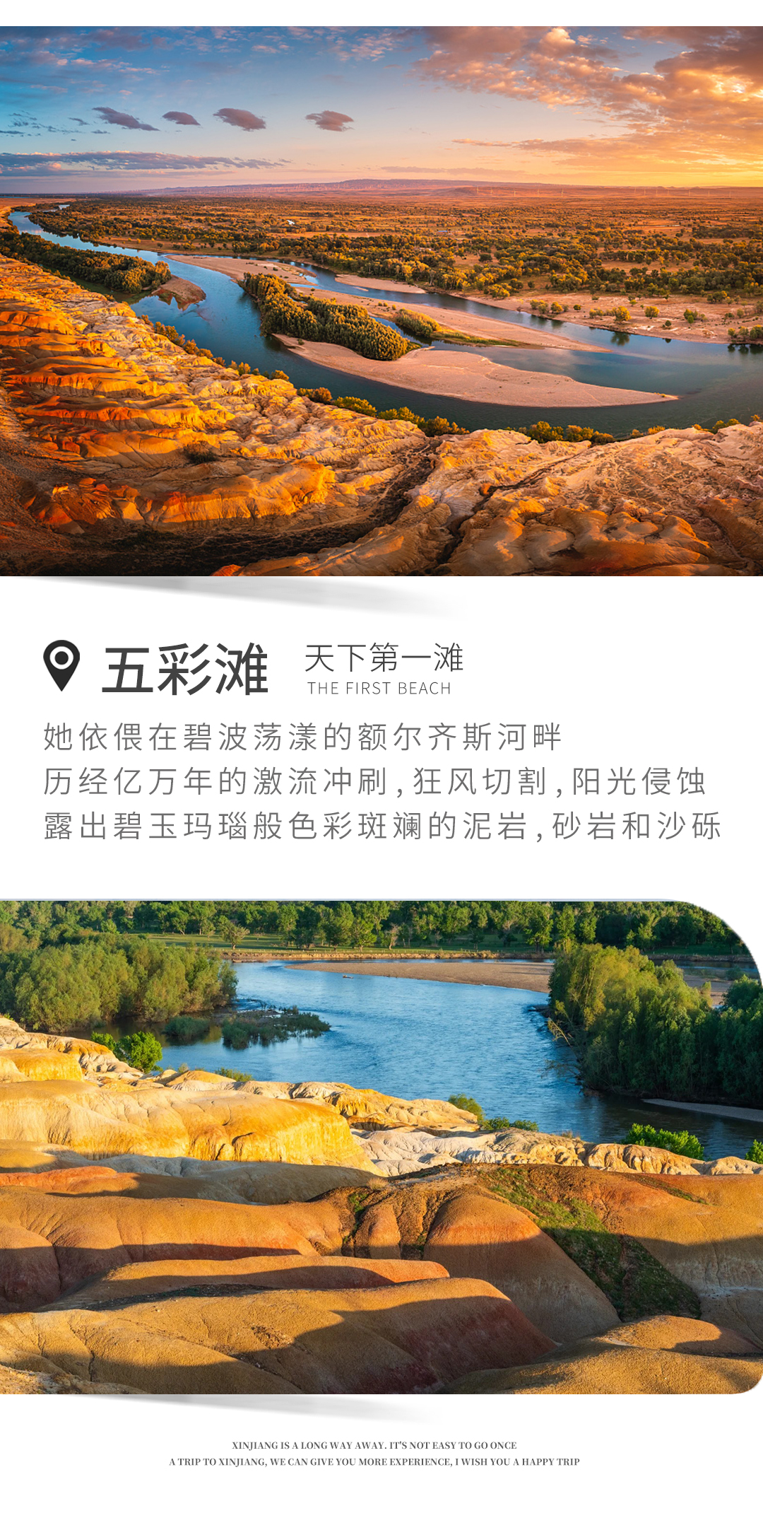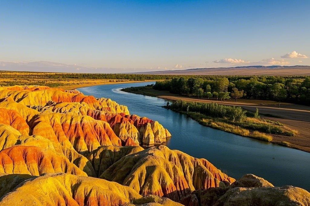 早餐后,开始下山,第一站抵达五彩滩,它是雅丹地貌的调色盘,赭红、金黄、灰白交织,如油画般绚烂。额尔齐斯河蜿蜒而过,夕阳下更显壮丽,是北疆不可错过的自然奇观。