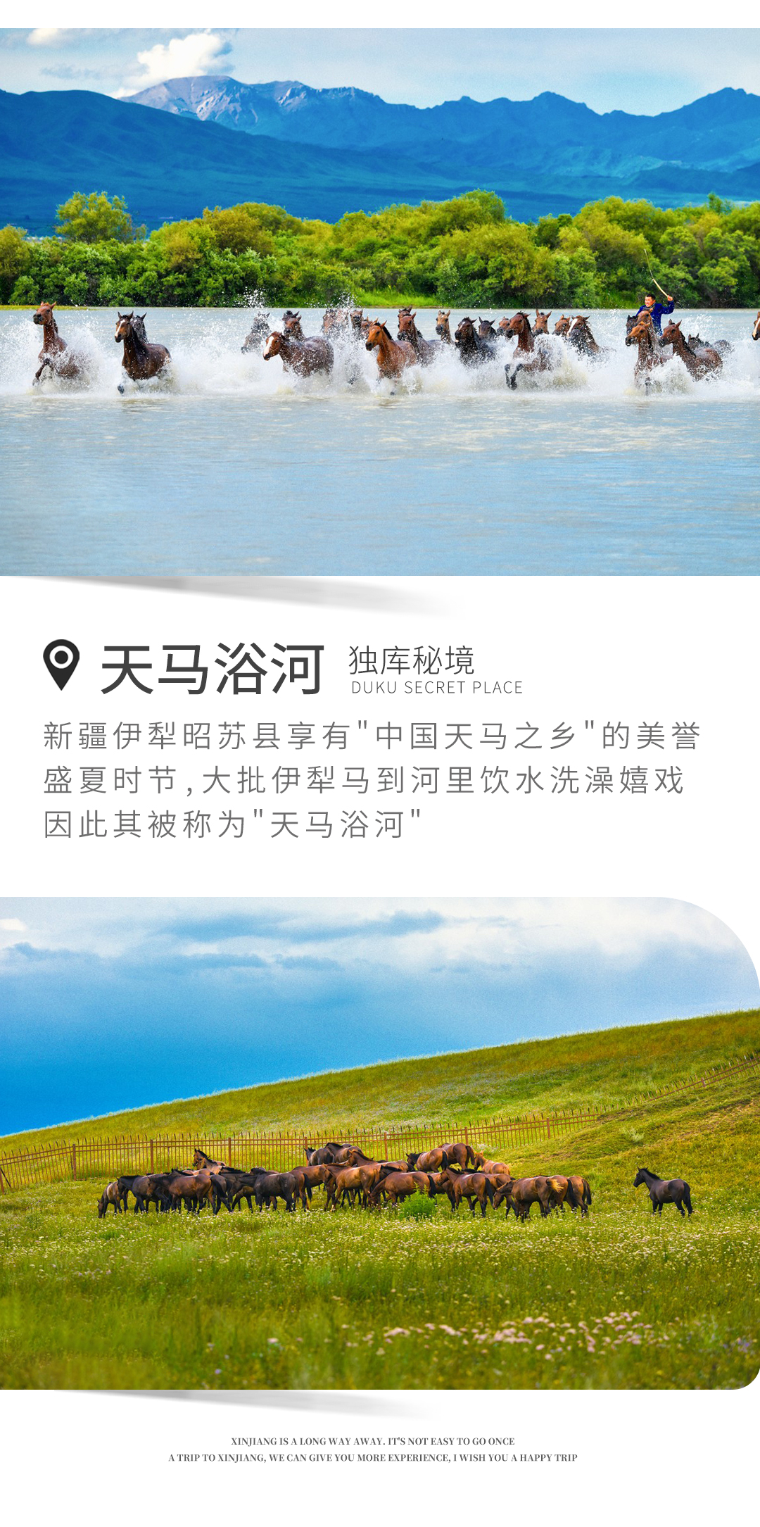早餐后约8点前往昭苏湿地,这里是伊犁州面积最大、海拔最高的高原湿地,也是中国为数不多的典型高原湿地公园,公园里森林茂密,芦苇丛生,水禽姿态优雅,争奇媲美,百鸟齐鸣,清脆悦耳,飞翔觅食,婀娜多姿。在这里,天蓝得过份,花开得放肆,景美得醉人,徜徉其中,整个身心都会彻底放松下来。新疆伊犁昭苏县享有"中国天马之乡"的美誉。盛夏时节,大批伊犁马到河里饮水洗澡、嬉戏奔腾,被称为"天马浴河"。2022年6月以来,昭苏县在湿地公园每天举行两次“天马浴河”节目表演。每次有40匹“天马”参加表演,牧民从山上赶着马匹一路驰骋而下,走近河岸。赶马人一声吆喝,马会立即在岸边停下来,稍微休整二三分钟,然后赶马人又一声号令,马瞬间跳进河流奋蹄奔腾而起,河面上水花飞溅四射,场面壮观奇美。