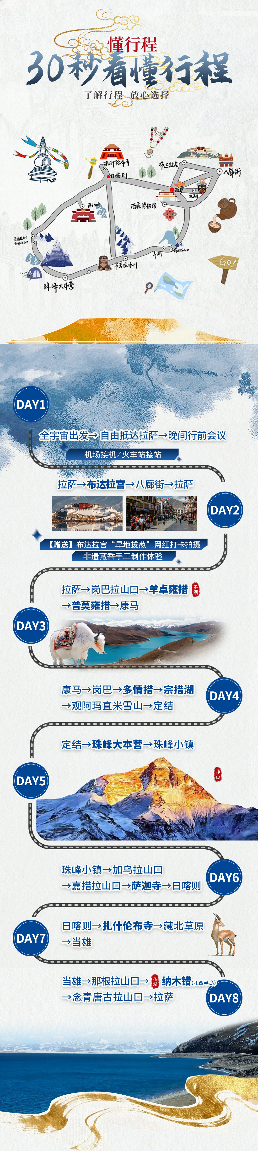 1.关于天气,在藏期间早晚温差较大,建议装备厚羽绒服+带绒冲锋衣+抓绒衣+宽松的裤子+舒适的鞋子+防风围巾;请队员做好防寒防雪的准备,雨衣或者雨伞。