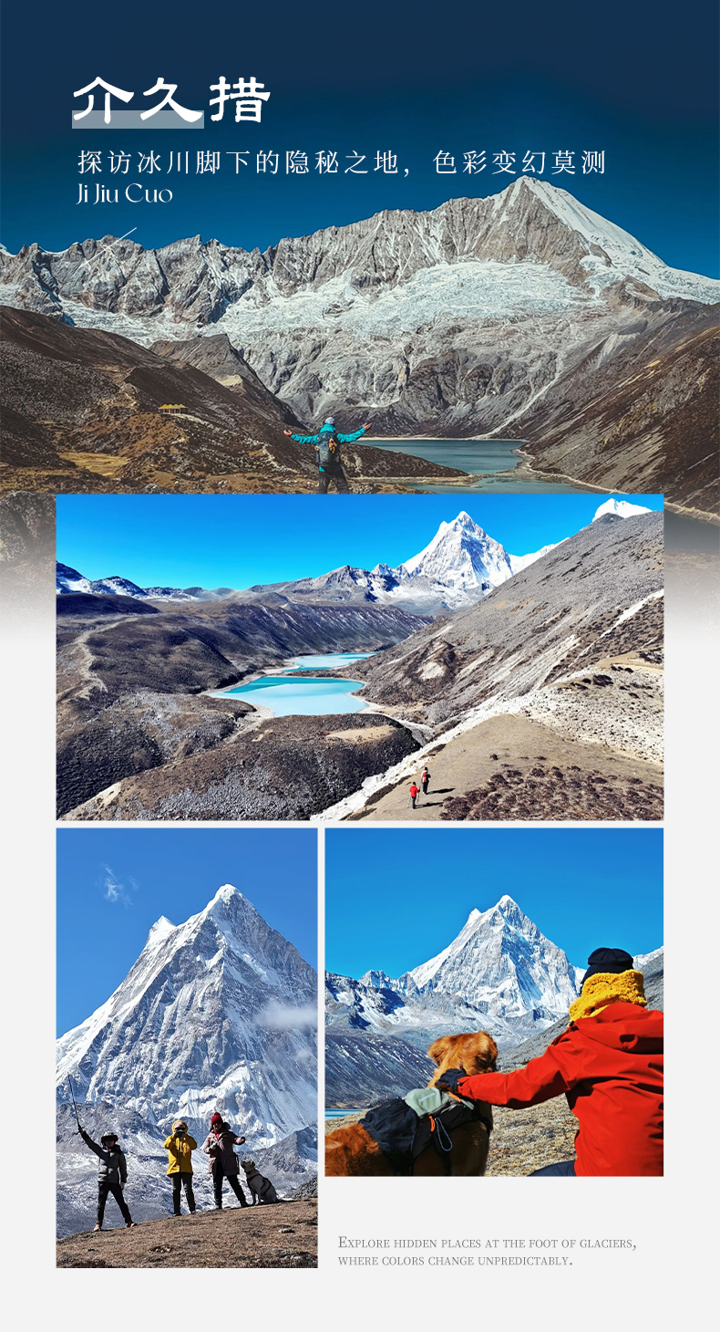 今日我们前往白马林错附近另一个湖【介久措】。沿着山坡爬到山脊处,美丽的圣湖就在你的眼前,天气好的话巨大的库拉岗日和卡日疆雪山展现在你的面前。体力好的可以沿小路下到湖边拍摄,然后沿湖左侧山脊一路往上观赏库拉岗日冰川下的冰湖。之后返回洛扎县城,当晚入住洛扎县