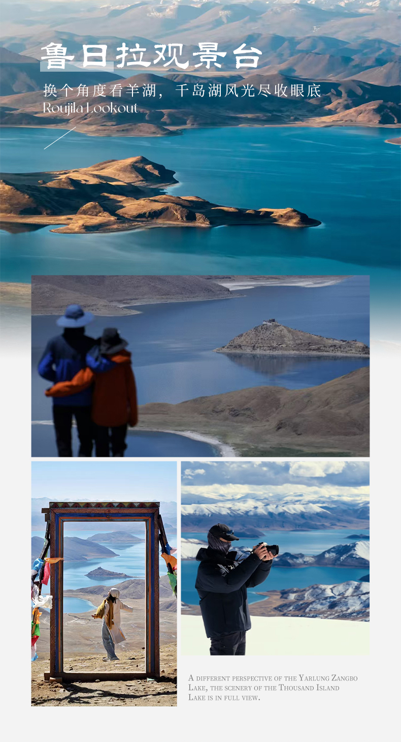 早餐后出发,沿着拉萨河出发前往【鲁日拉观景台】,鲁日拉观景台海拔4960米,这里的羊湖,仿若“千岛之湖”,峰谲云诡,奇秀婉约,与远处的云光、雪山连成一片。此处确实是俯瞰羊湖的极佳位置,极目远眺,天色、山色、湖色交相辉映,仿佛一面被冰冻的蓝色汪洋,让人不禁感叹大自然的鬼斧神工。