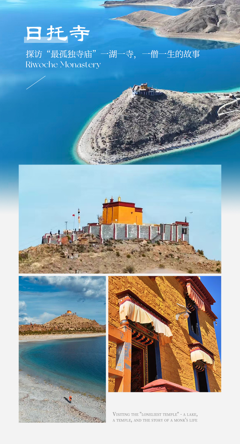 羊湖广阔的水面与周围的山脉相互交织的中央是一座小寺庙,它就是【日托寺】。它是公元14世纪末由东拉圣僧夏加顿珠叔侄所建的一座萨迦派寺庙,至今有600余年历史。这里孕育着藏族独特的孤傲与纯洁,传说它是“世界上最孤独的寺庙”。