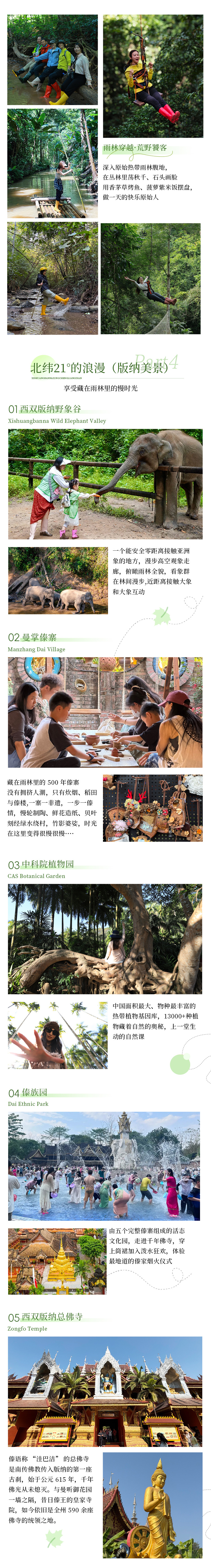 景点:行程所列景点门票(曼听公园、告庄西双景、野象谷、勐泐大佛寺、中科院植物园、雨林徒步体验、曼远傣族古寨);