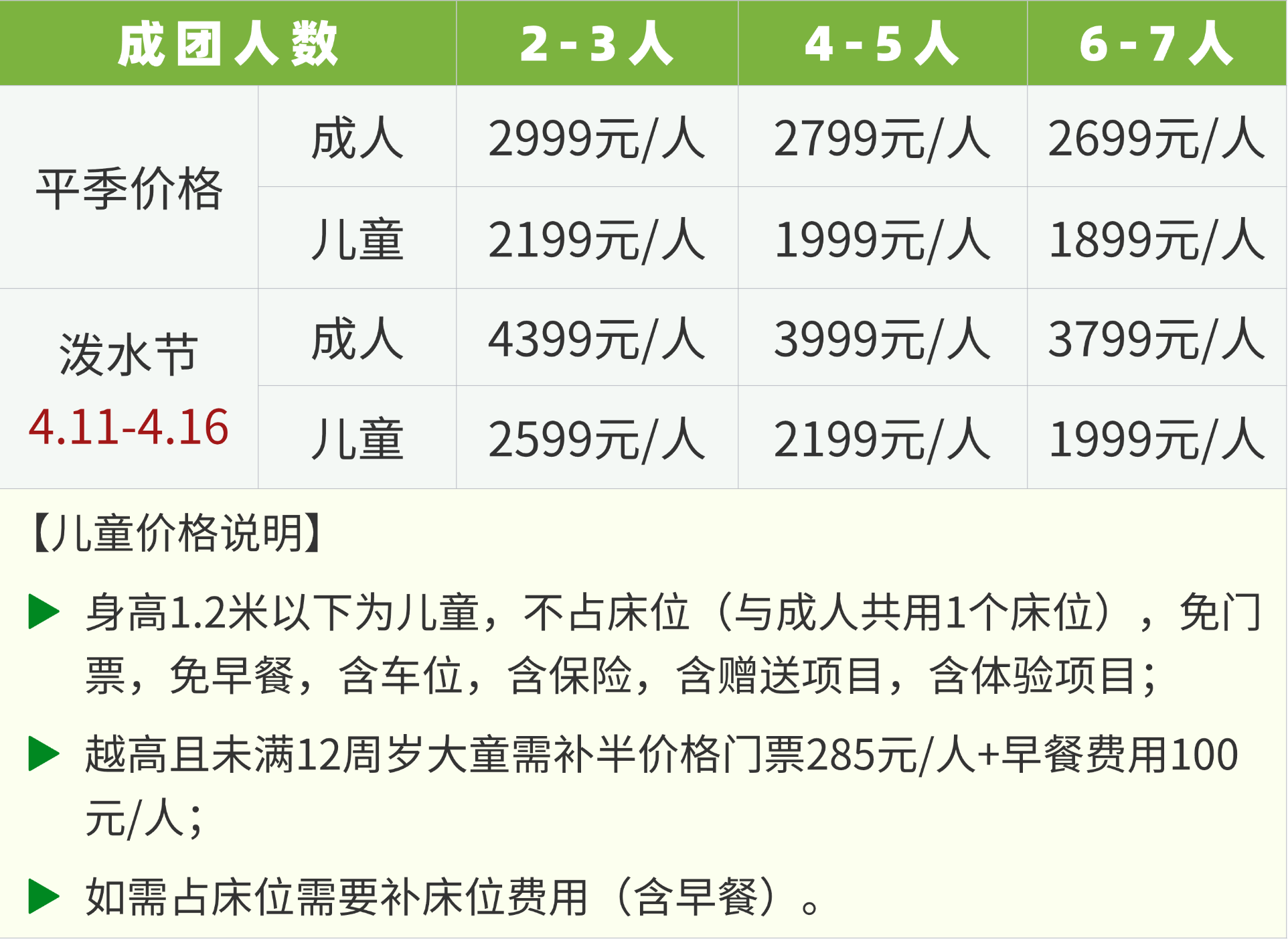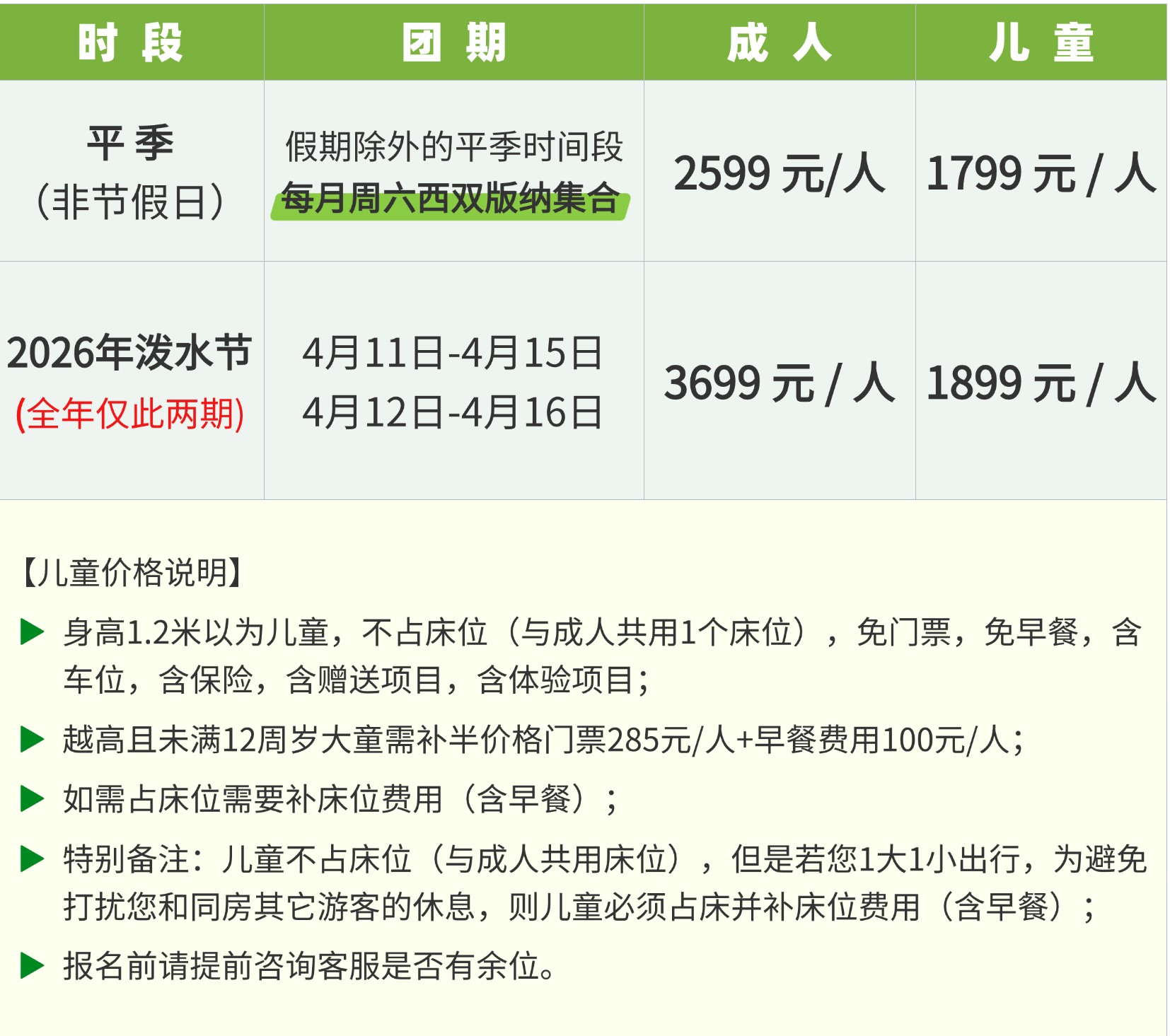房差:自然拼房2-3人标准间,如不愿拼房或拼不了房者须补单房差(平季800元/人,春节/泼水节1500元/人);