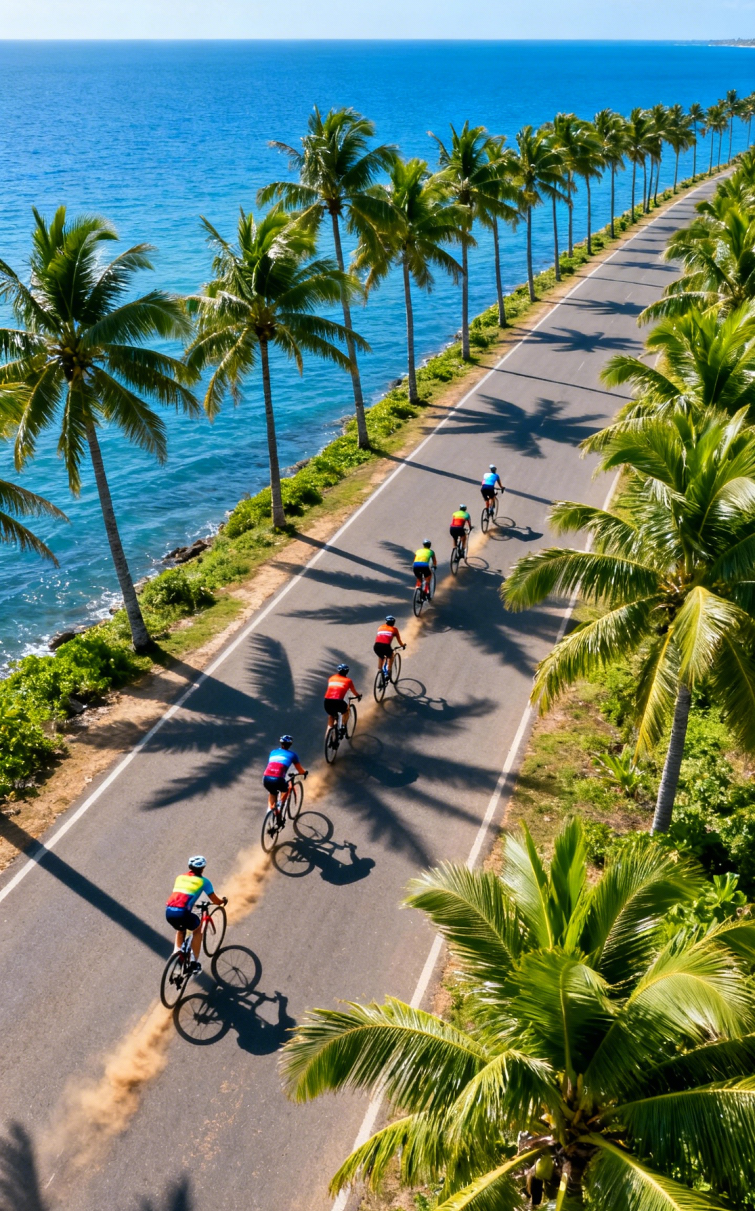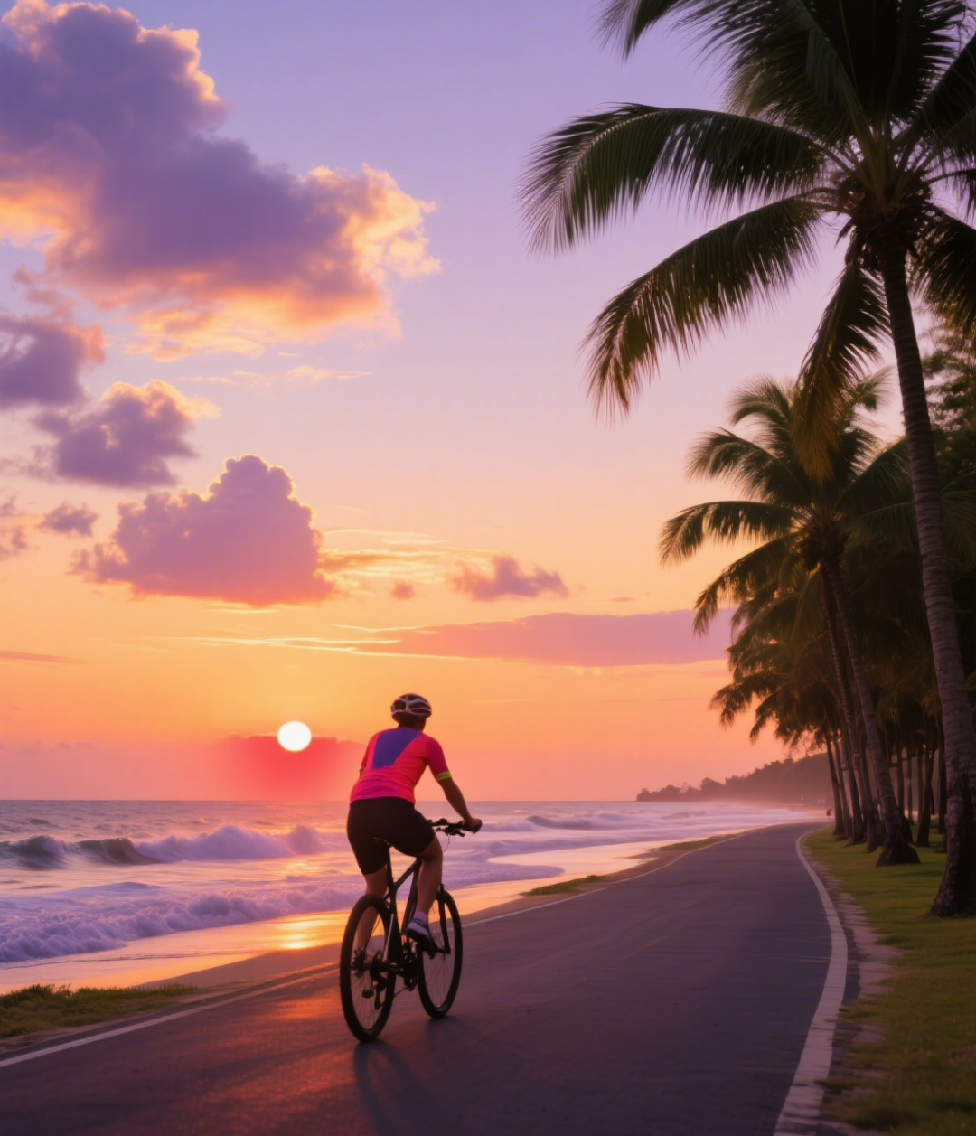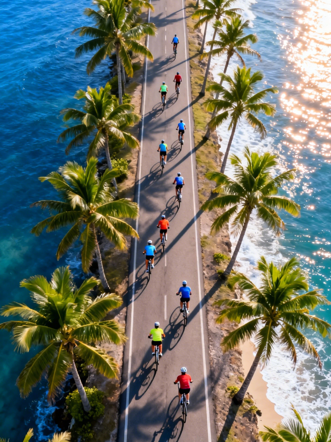 14:30—17:00:海岸线骑行,左手青山右手碧海,彩虹跑道与蔚蓝海岸相映成趣,海风拂面间尽享骑行的快乐