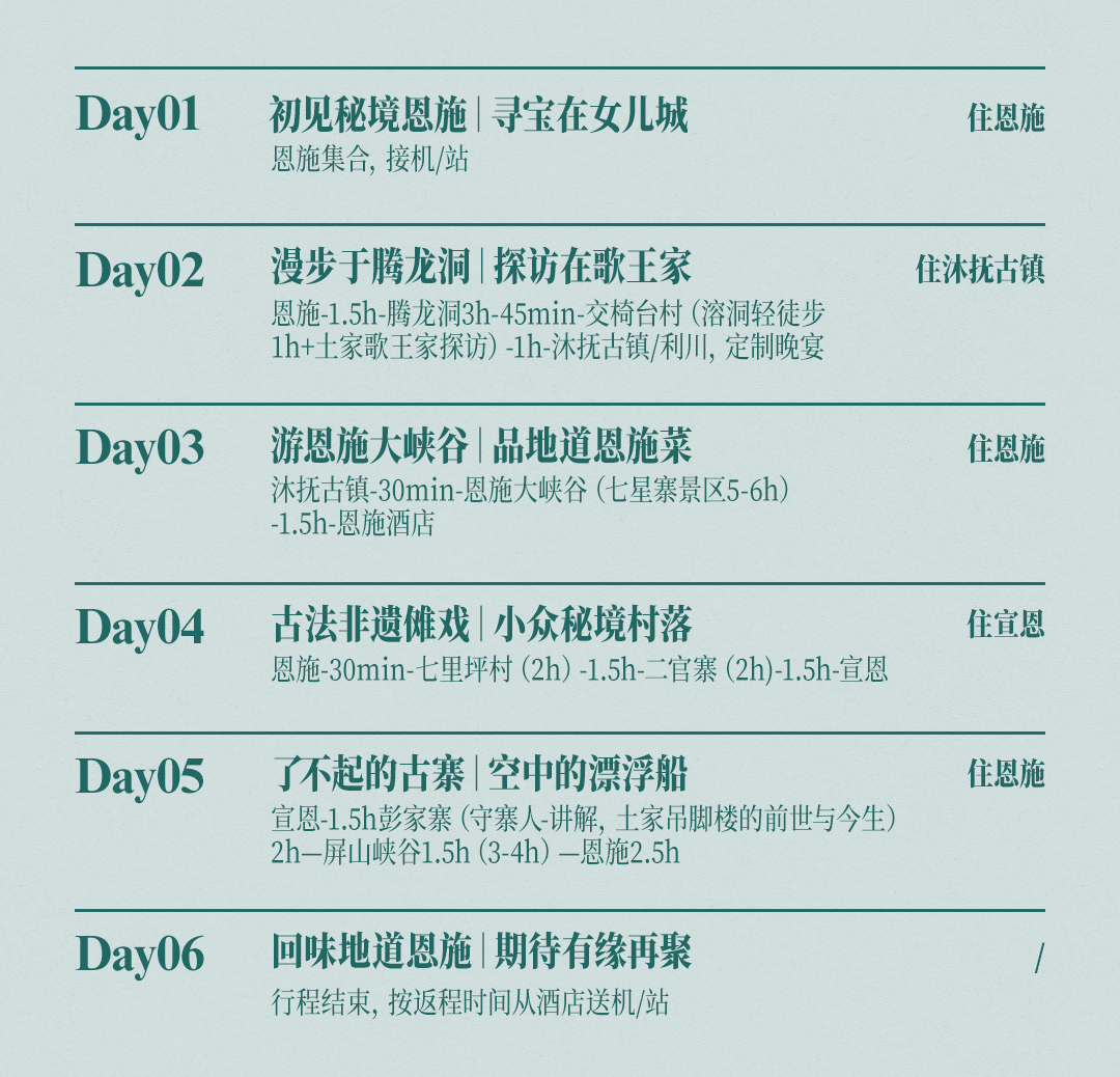 当日将大家送往恩施机场或恩施火车站。(建议队员提前预定机票或火车票,将返程时间告知旅行小管家,合理安排车辆配送!)如预定次日大交通返程,可提供代订住宿服务。