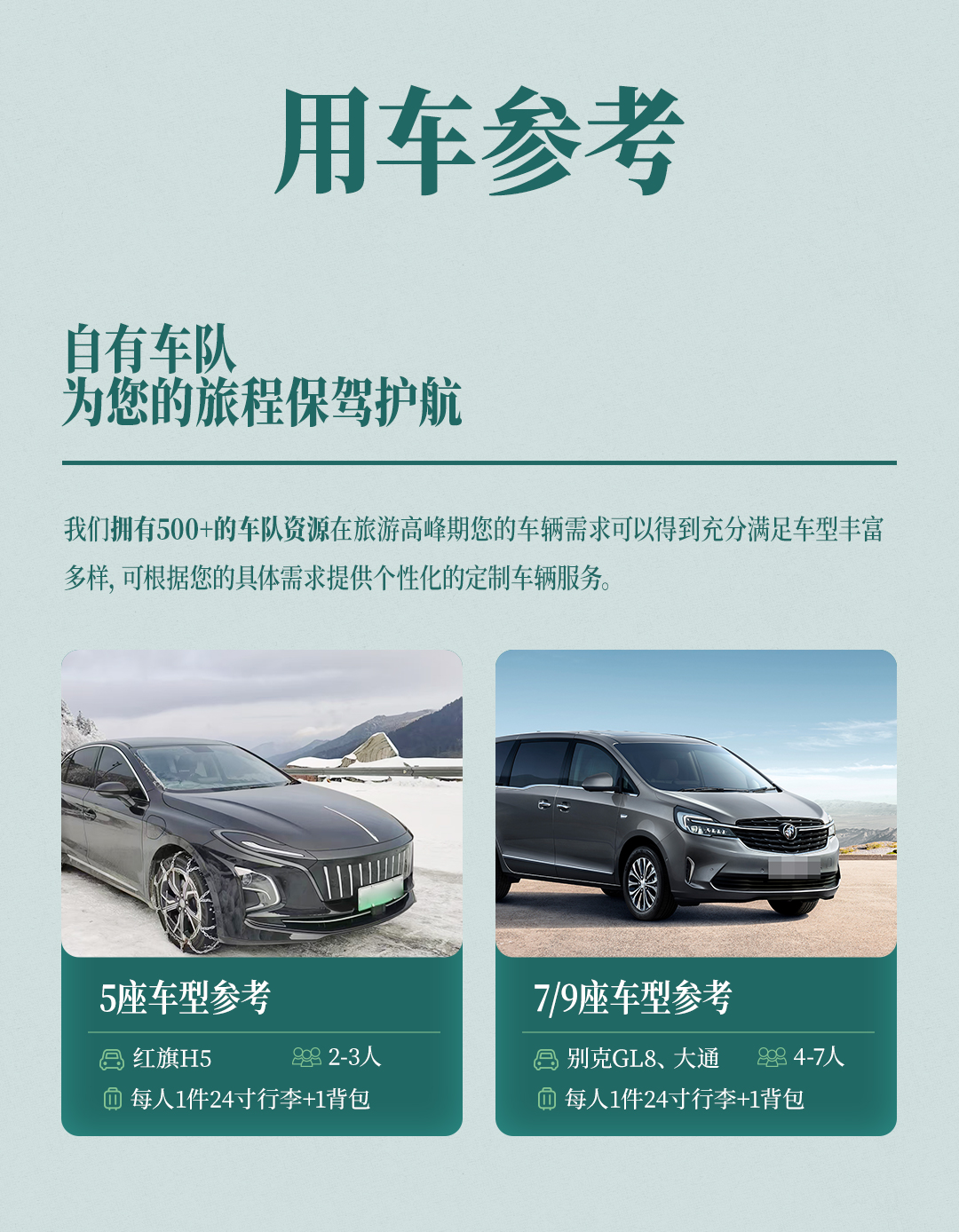 【私家团价格】轻车独立小团(随时发团·一单一团) 私家团可指定任意时间成团,服务标准与以上排期产品等同,如需摄影航拍、人文精讲、在地体验等升级服务,可联系客服提供专属定制旅行服务 |
