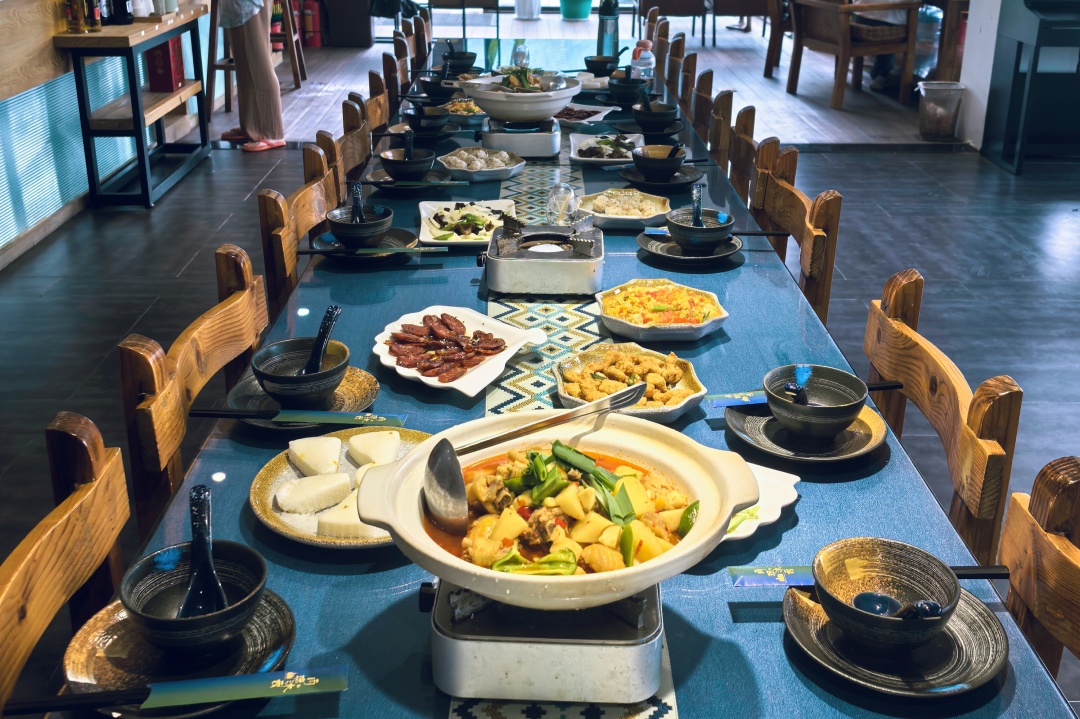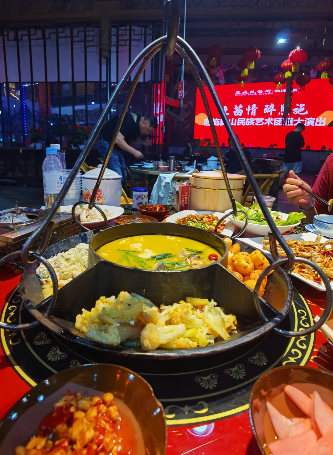 游览完恩施大峡谷,推荐大家体验恩施当地比较有特色的吊锅宴,吊锅宴是少数民族独特的一种宴席,百味特色,共火而食,一半是炙热的火焰,一半是热气腾腾的吊锅, 一边品美食,一边欣赏表演,沉浸式体验少数民族风情。